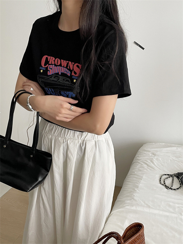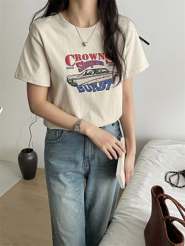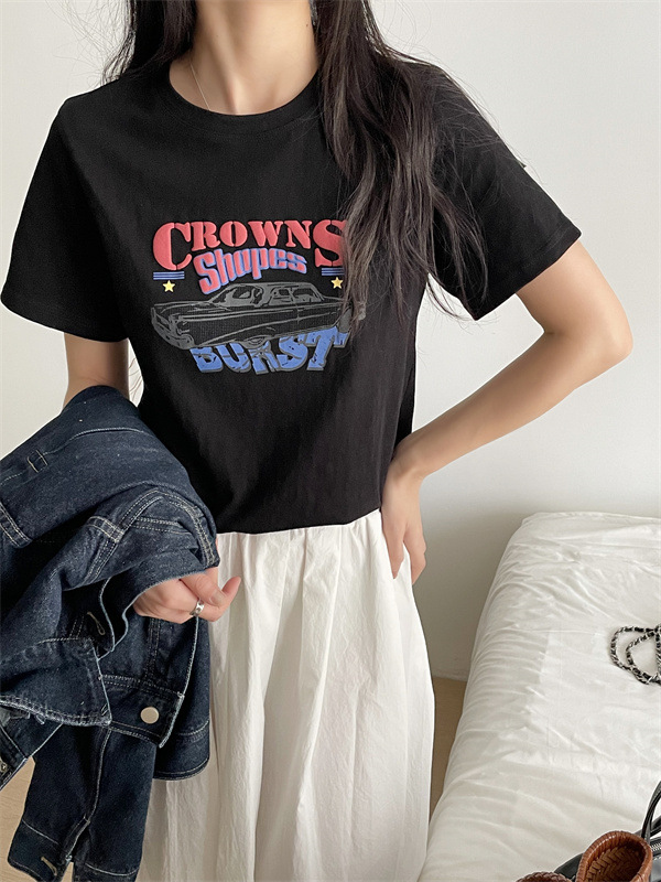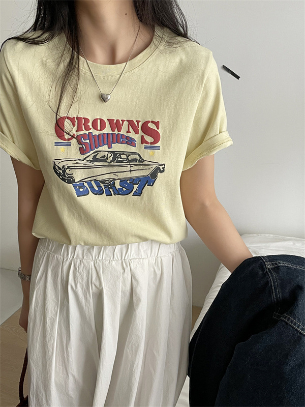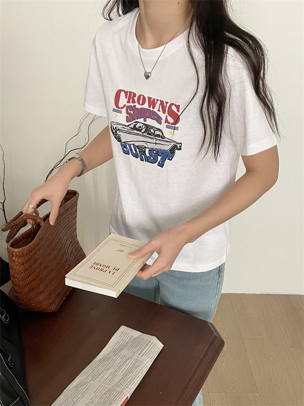 汽车印花短袖T恤女年春夏新款圆领正肩休闲打底衫上衣
