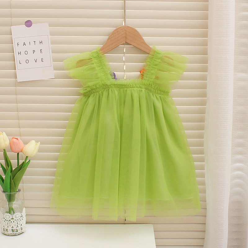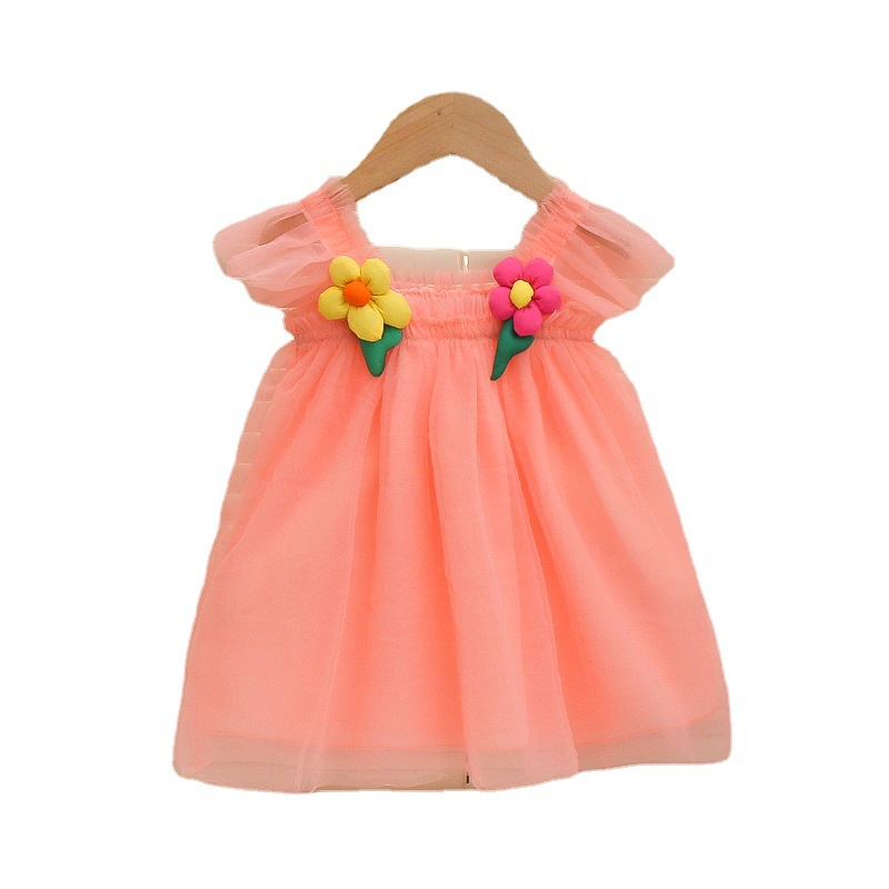 儿童裙子夏季小飞袖网纱裙韩版花朵装饰洋气可爱田园风无袖连衣裙