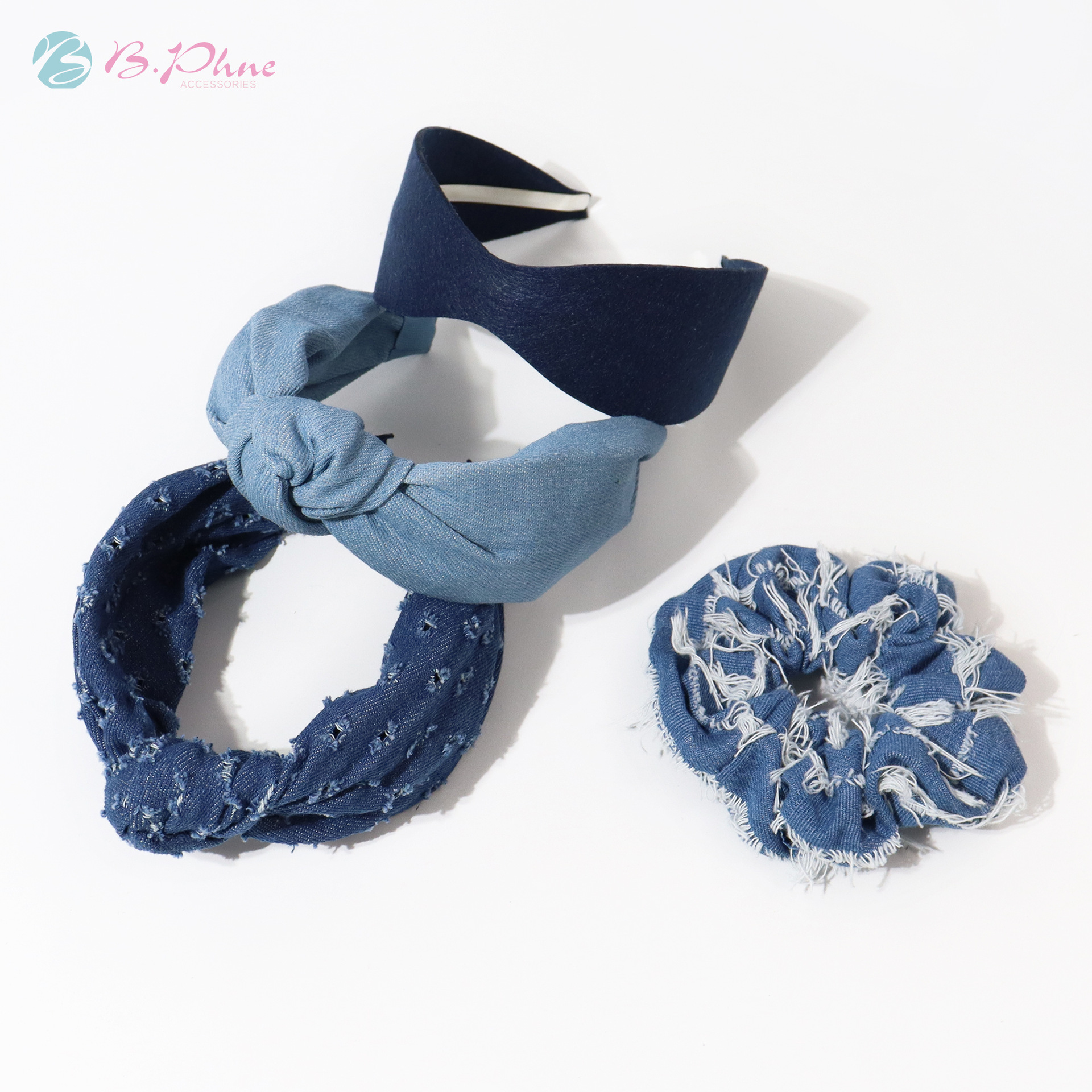 新款时尚破毛牛仔发箍布艺宽边头箍洗脸发窟手工打结发捆发饰套装