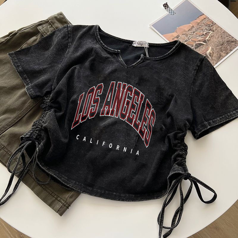 水洗做旧V领t恤女春夏复古小众纯棉短袖抽绳修身显瘦辣妹短款上衣