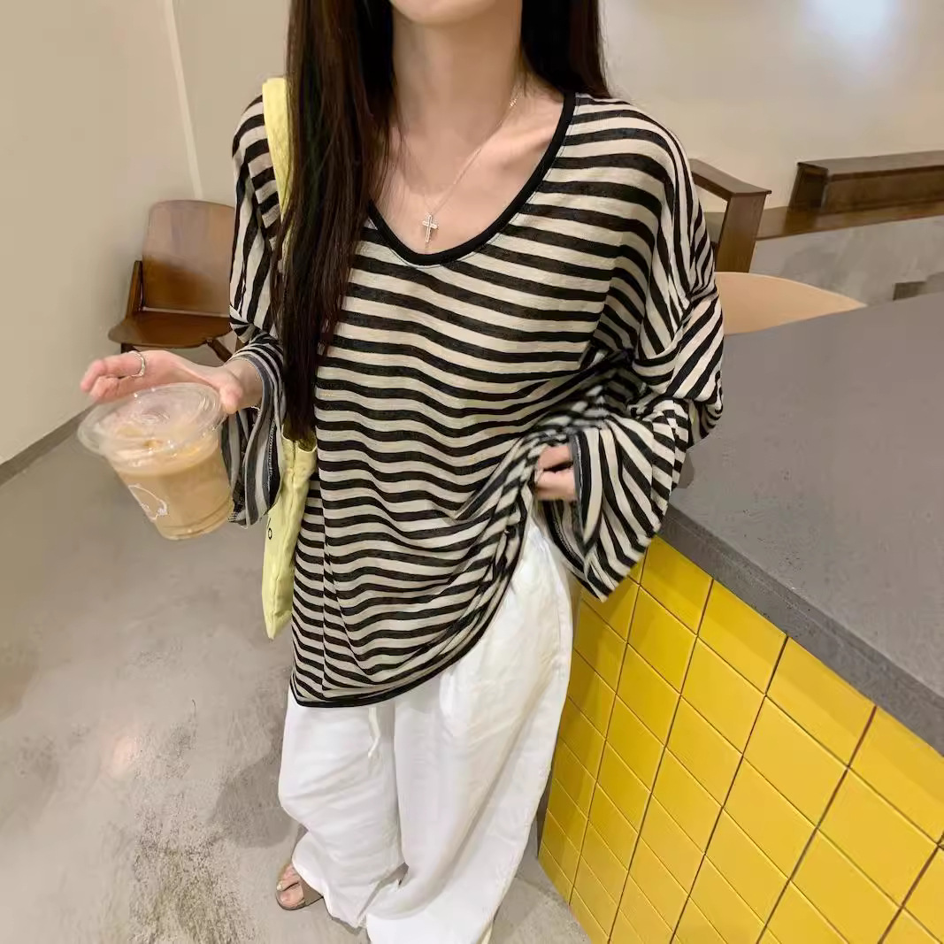 螺纹条纹防晒罩衫慵懒风V领宽松薄款上衣宽松t恤女薄款长袖设计感