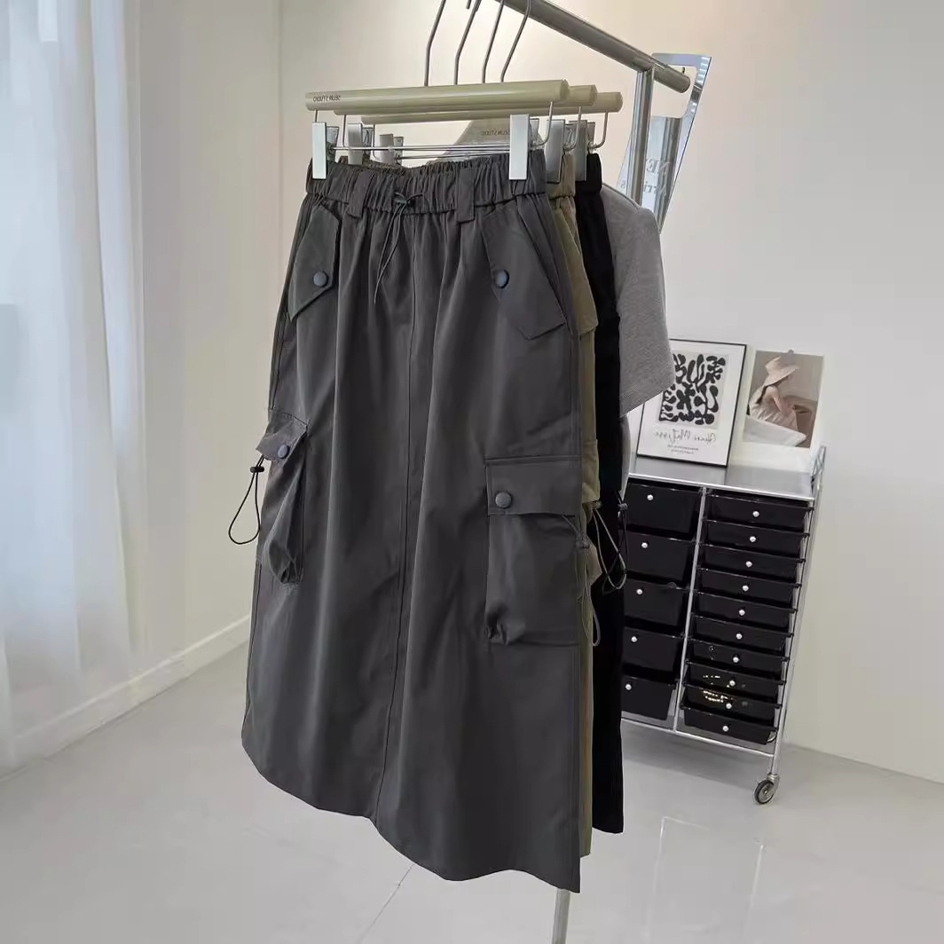 春夏新款韩版高腰复古工装半身裙女开叉显瘦A字裙宽松口袋中长裙