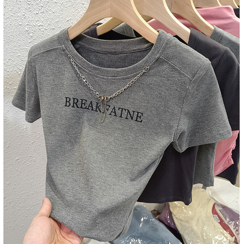 短袖t恤女夏季新款螺纹圆领正肩印花设计感修身短款上衣ins