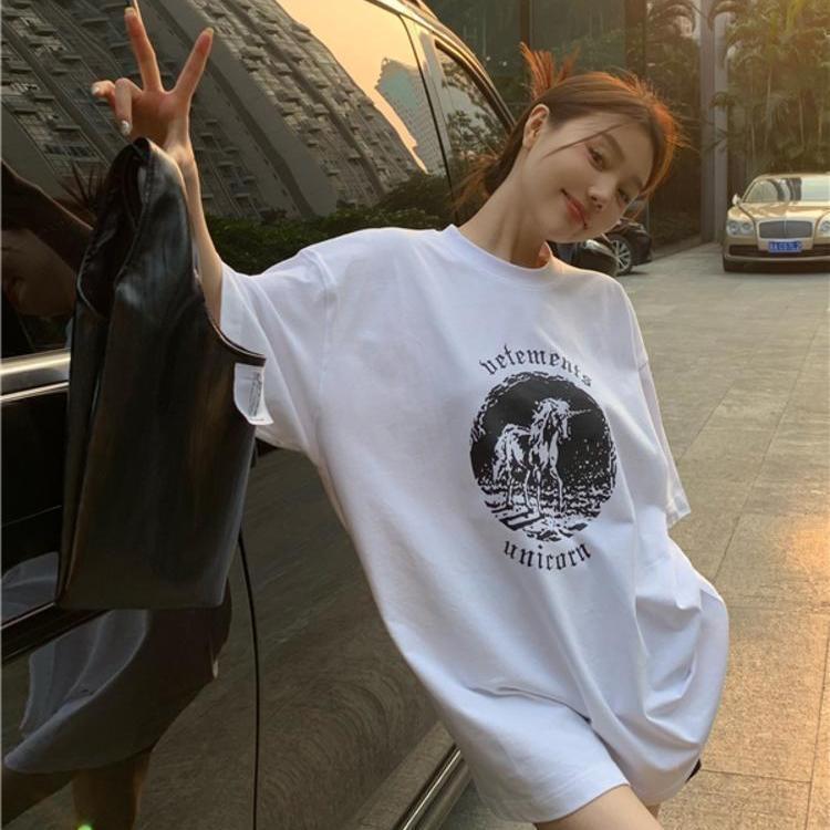 莫代尔美式半袖独角兽印花短袖T恤女夏季宽松慵懒下衣失踪上衣潮