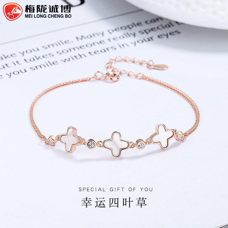 四叶草白贝母手链女925纯银小众轻奢ins玫瑰彩金黑玛瑙闺蜜手饰品