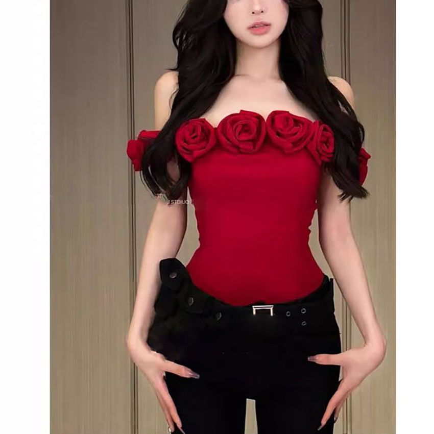 辣妹纯欲红色立体花朵露肩女夏季高级感绝美修身一字肩短款小上衣
