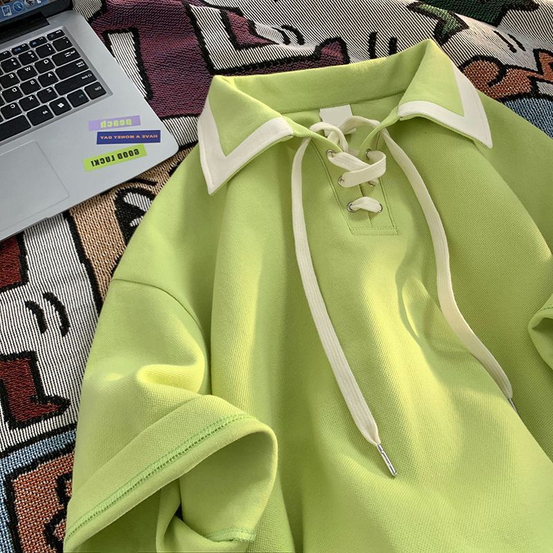 大码300斤日系复古POLO领衫短袖T恤女夏小众设计感半袖上衣