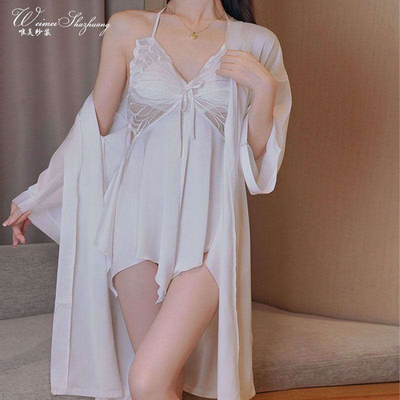 唯美纱新款性感睡衣女挂脖系带深V纯欲睡裙镂空透视蝴蝶吊带睡裙