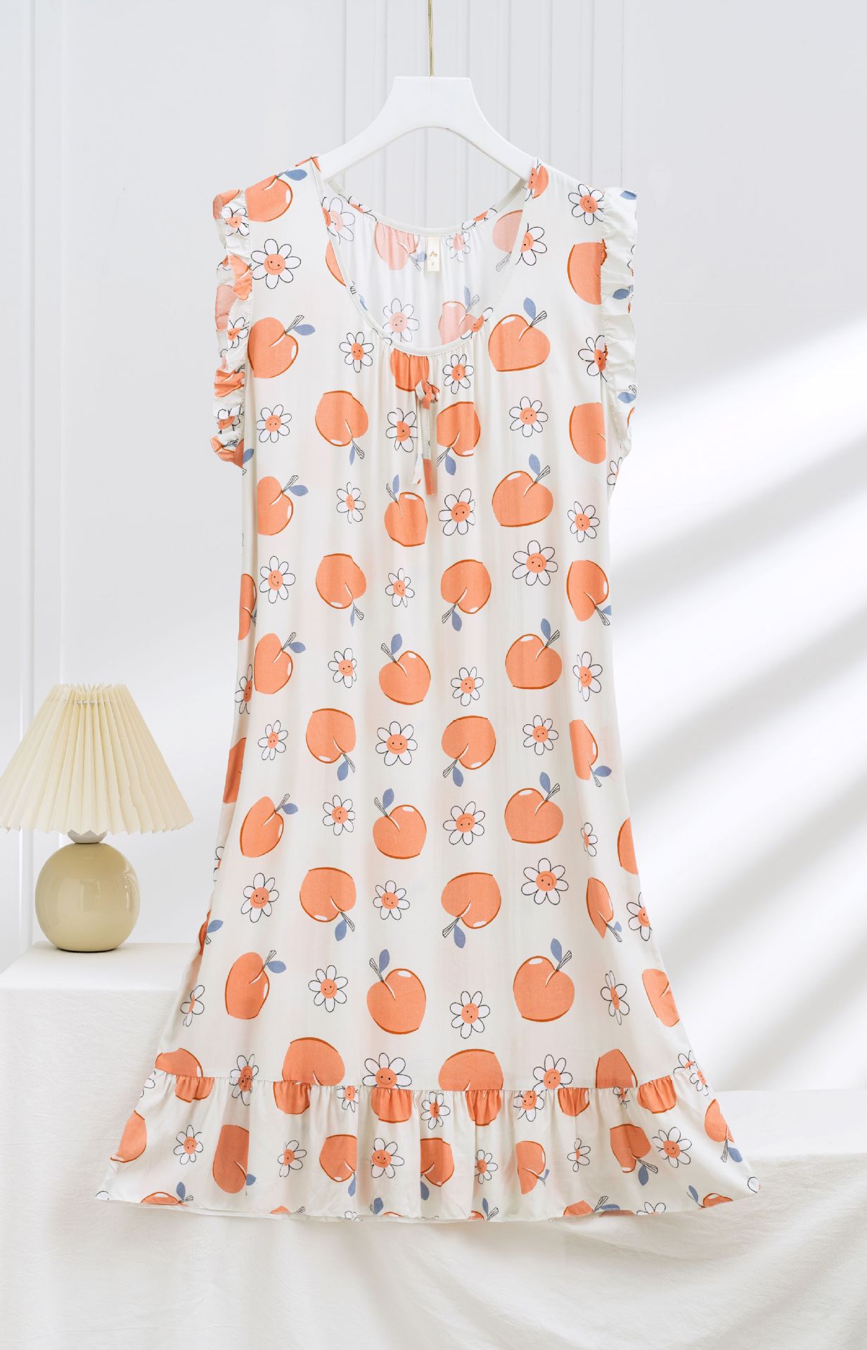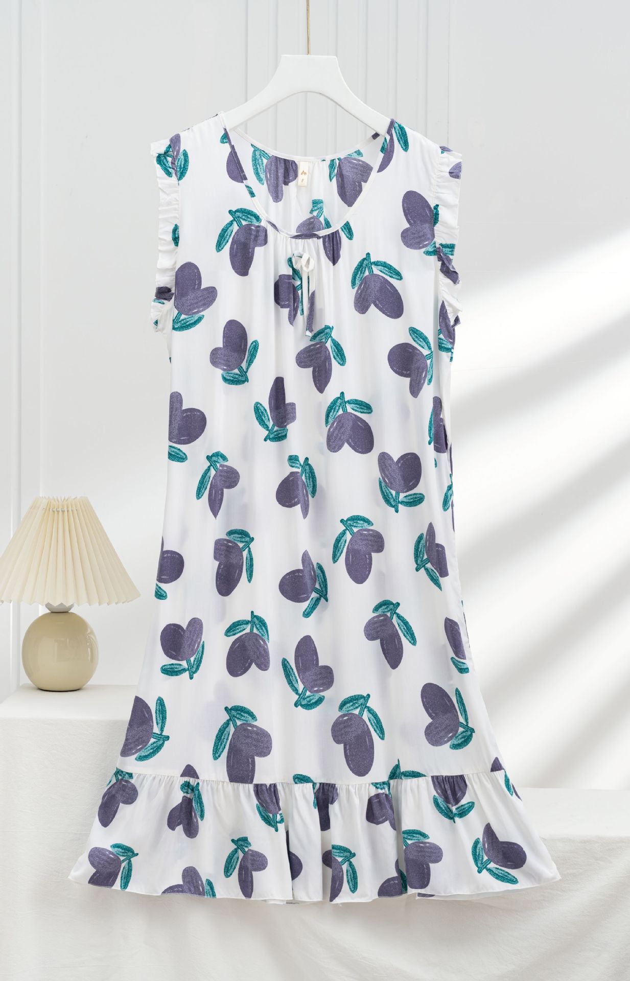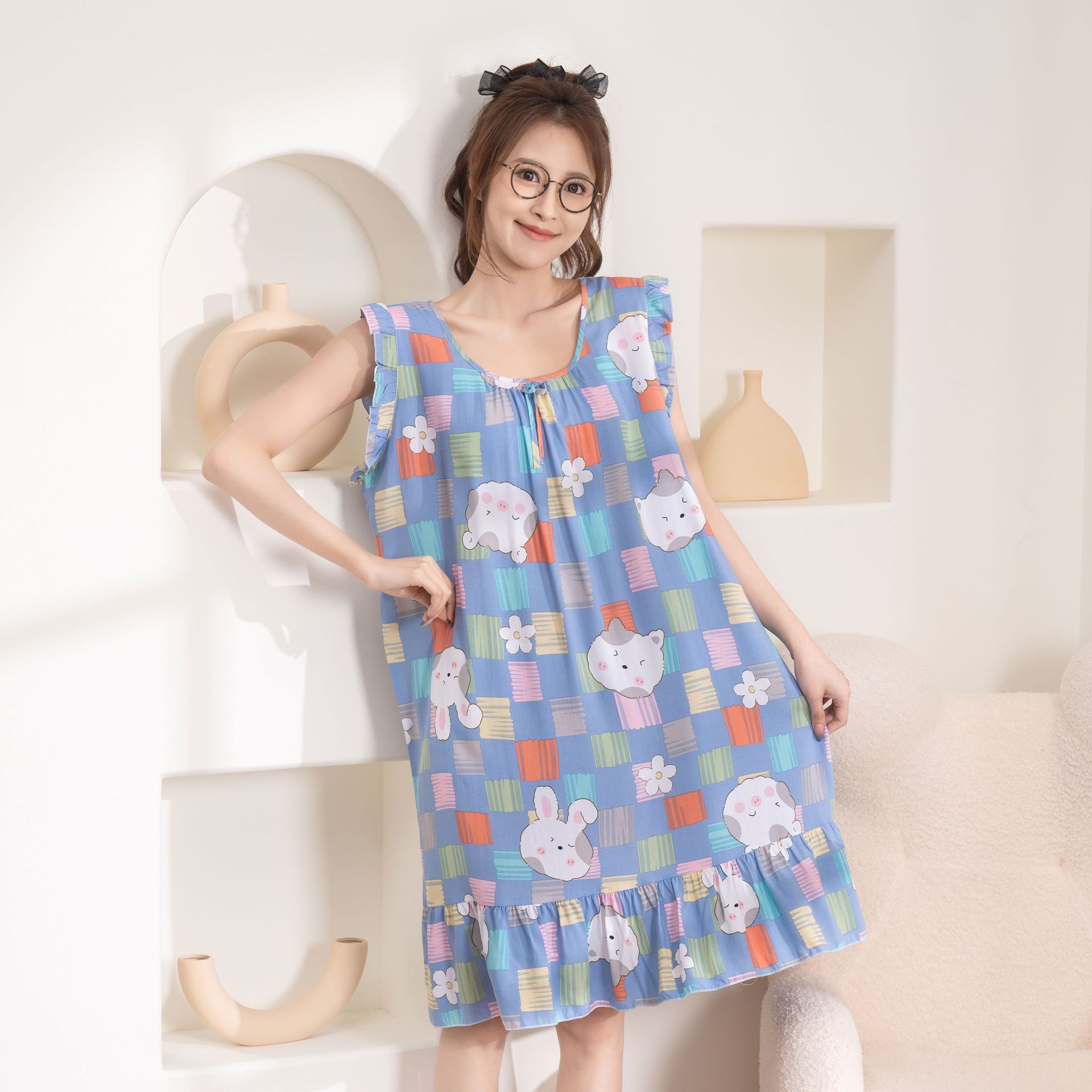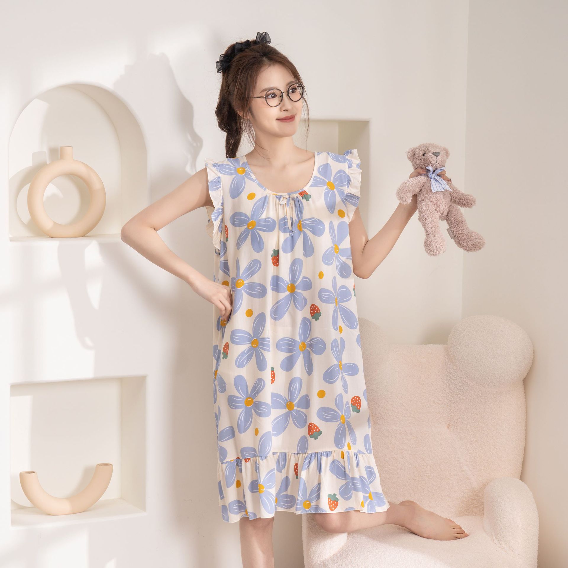 现货新款女式春夏秋季绵绸坎袖睡裙简约休闲薄款宽松家居服