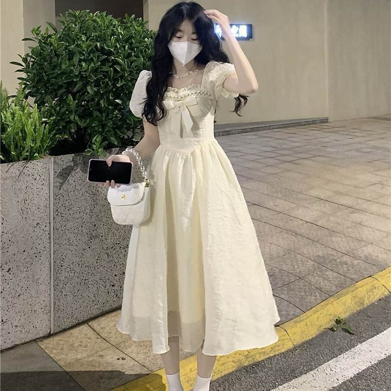 甜美初恋连衣裙女新款夏季气质蝴蝶结收腰显白公主裙过膝长裙