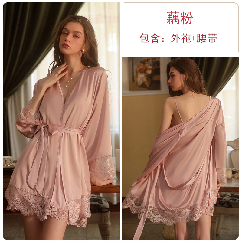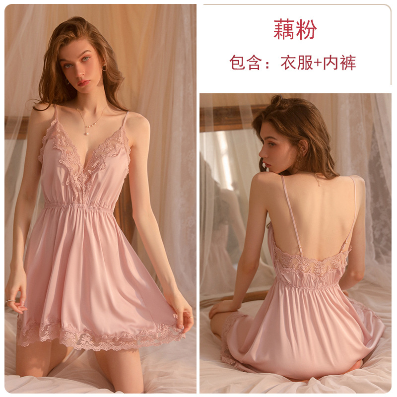 瑰若居家大码蕾丝性感深V露背睡衣纯色吊带睡裙睡袍家居服套装267