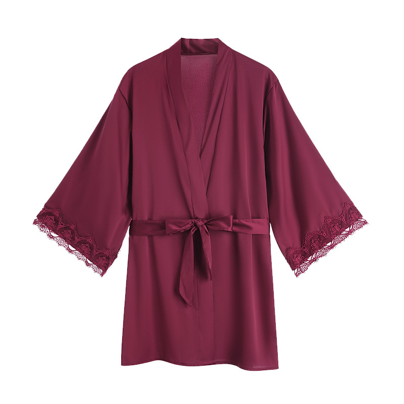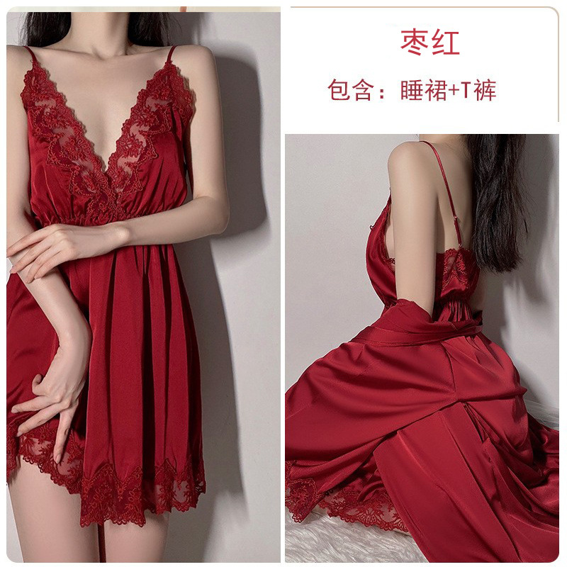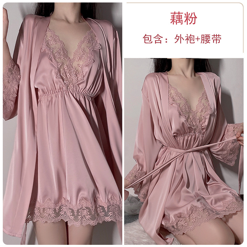 瑰若性感深V薄款睡衣蕾丝透视吊带睡裙系带外袍家居服套装