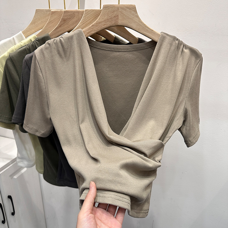 欧货V领短袖T恤女夏季新款性感修身显瘦交叉低领褶皱体恤上衣