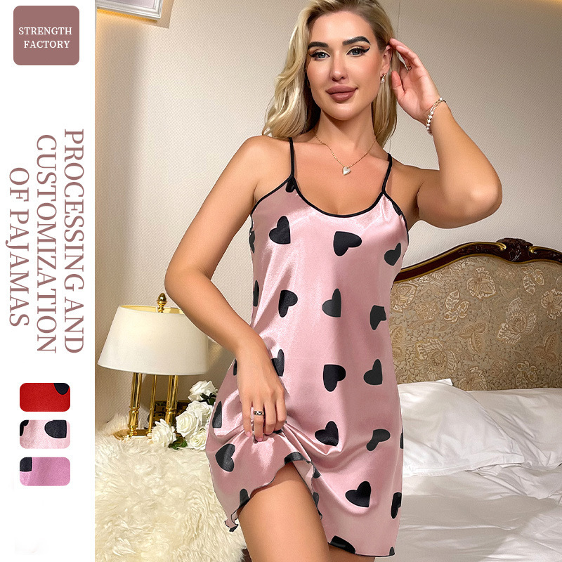 外贸跨境爆款露背冰丝吊带仿真丝绸睡裙夏季爱心睡衣短裙女居家服