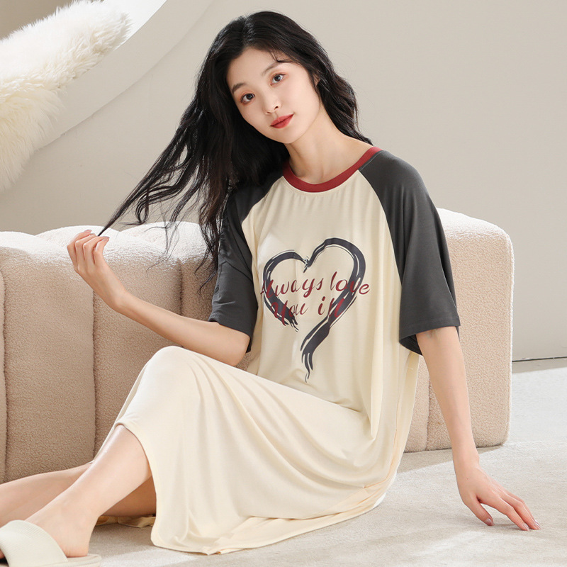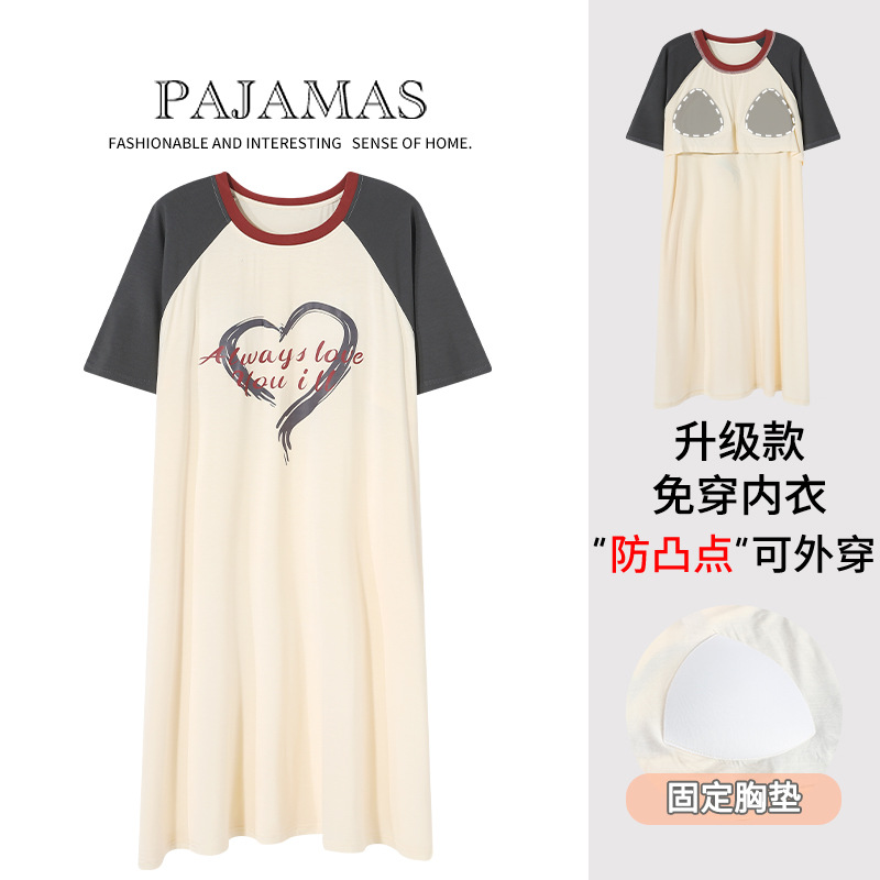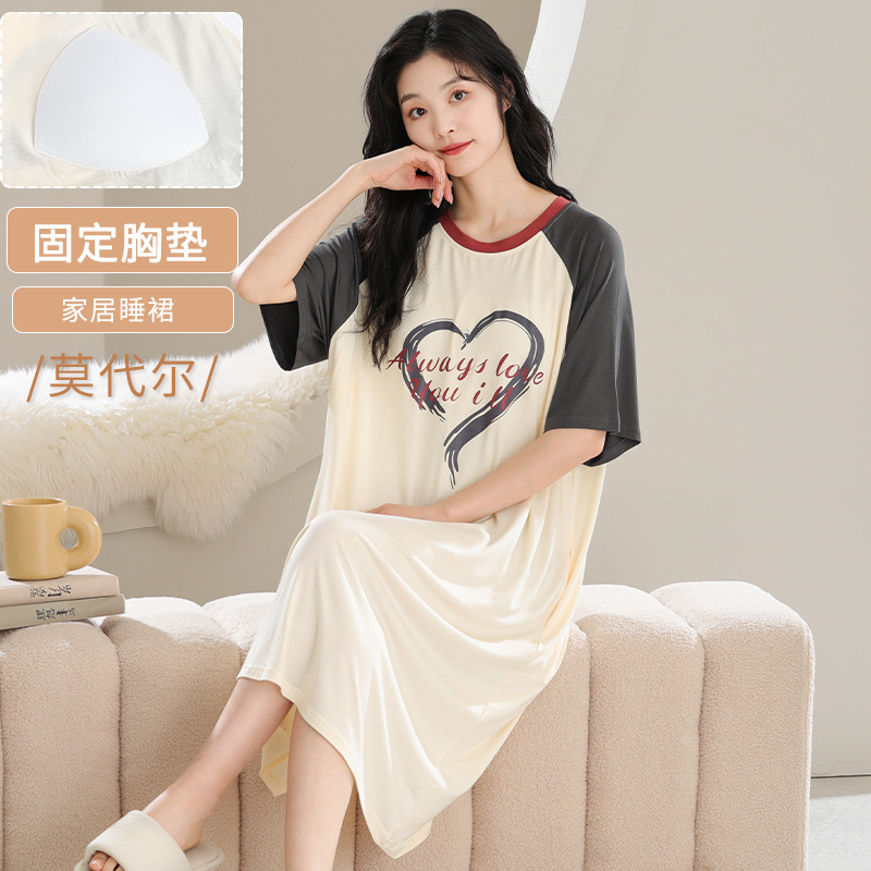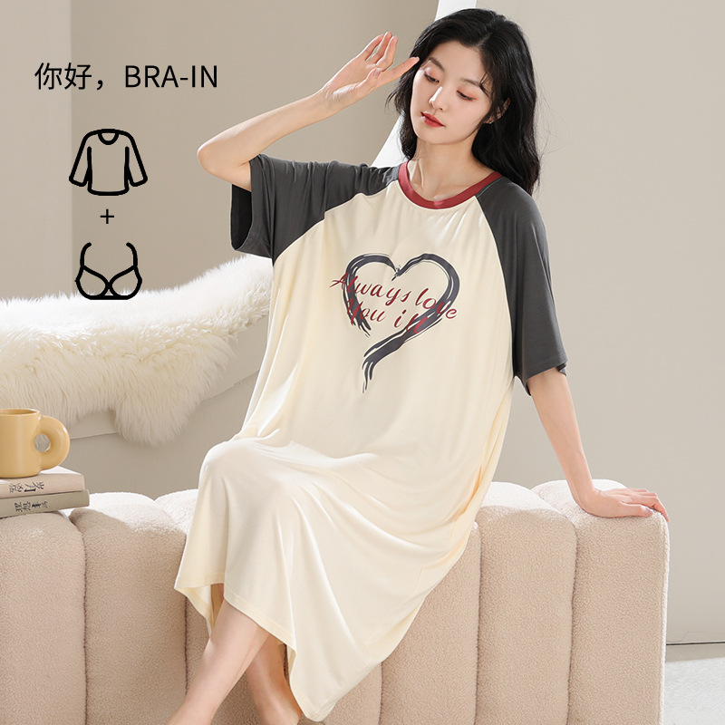薄款睡裙女夏莫代尔带胸垫短袖可外穿中长款睡衣加大码家居服