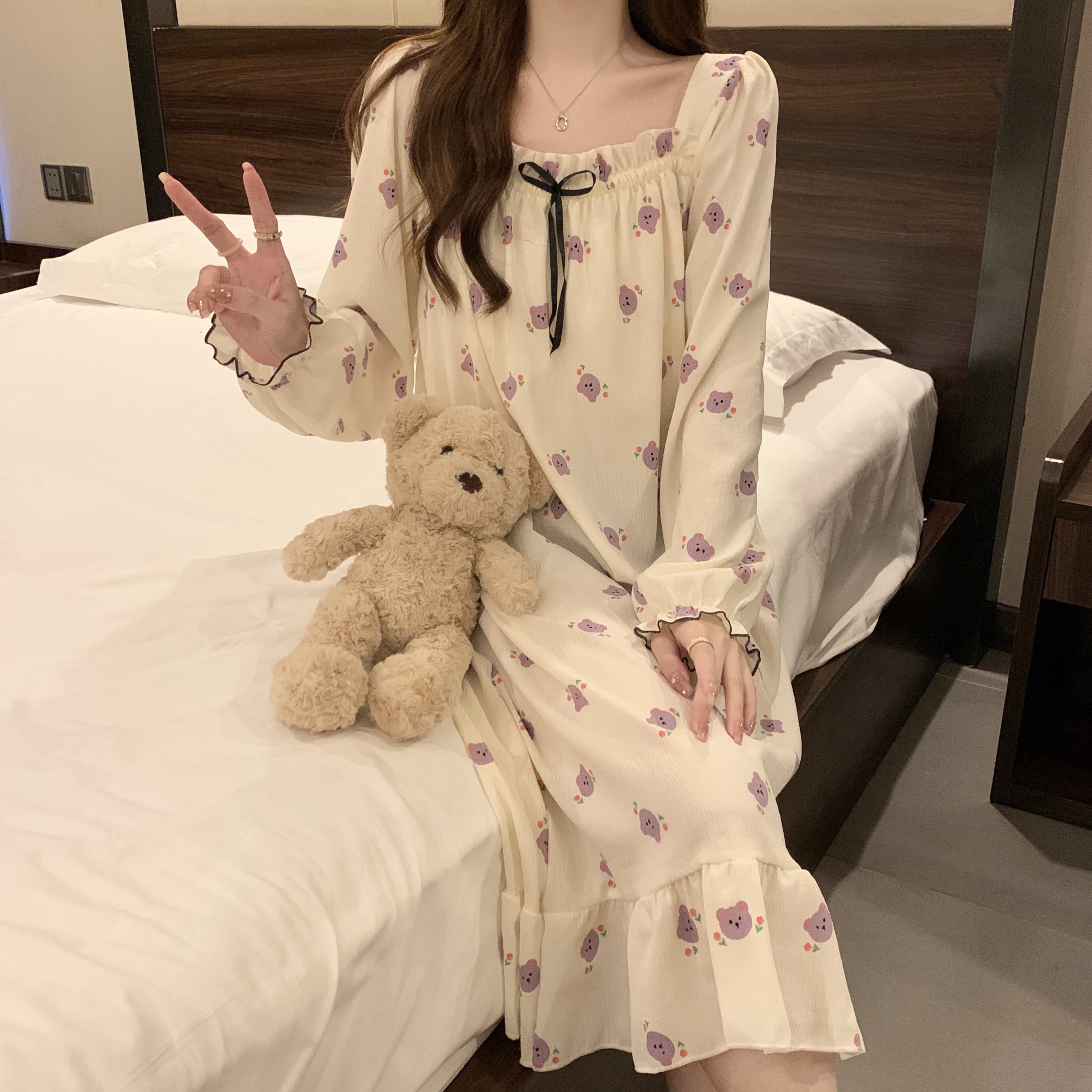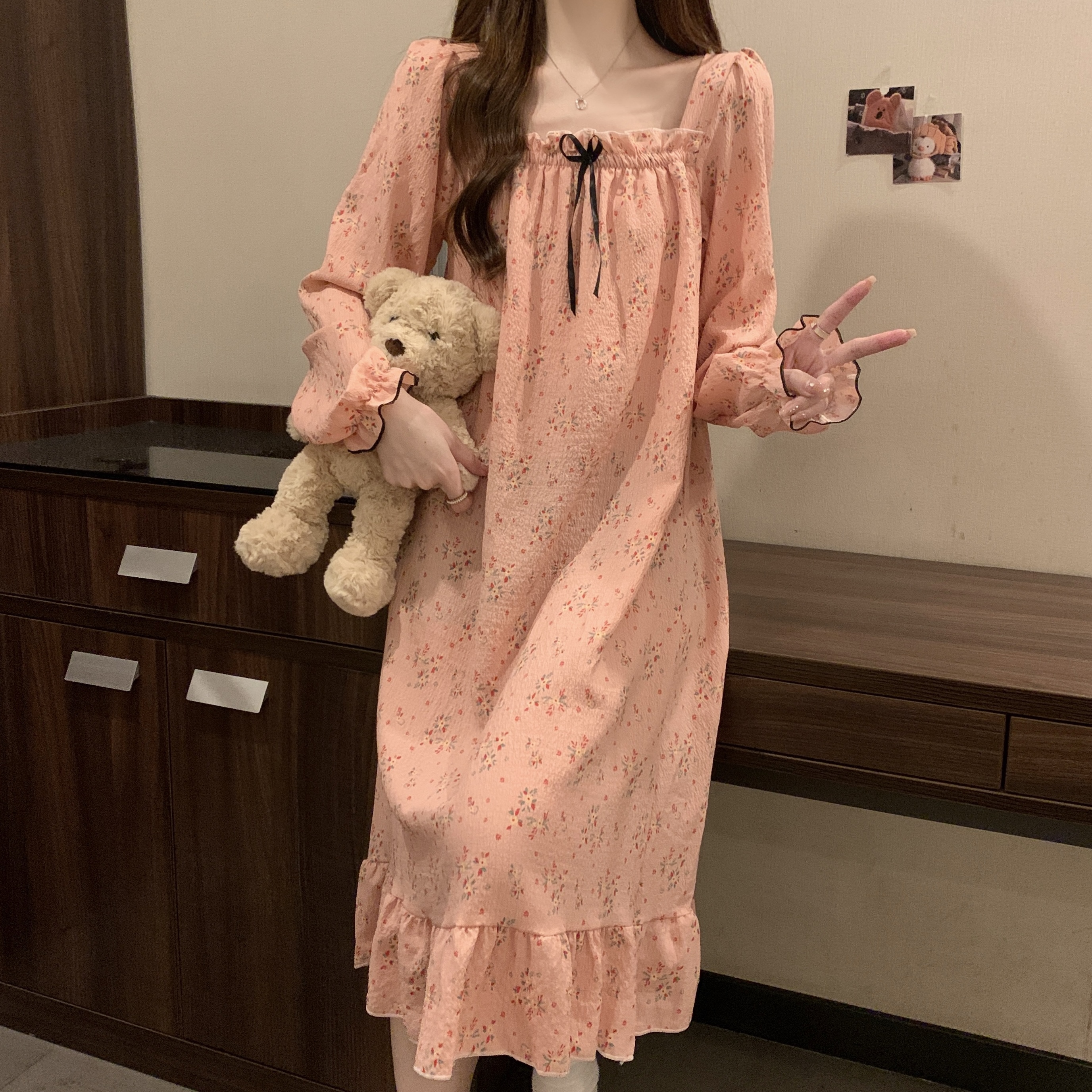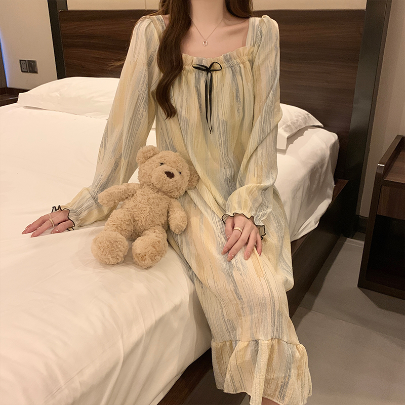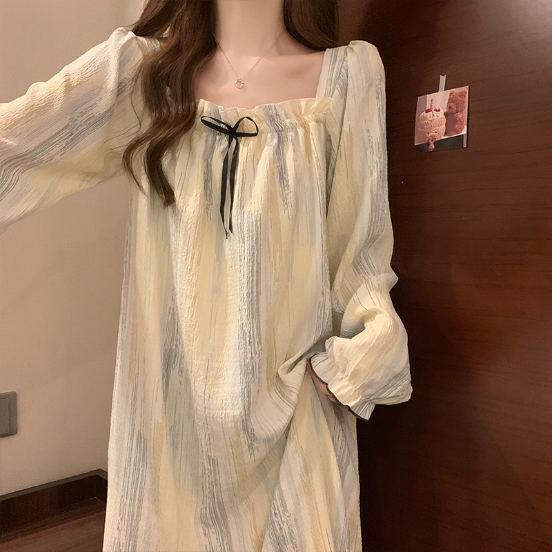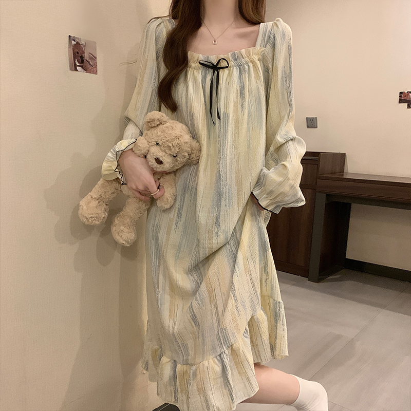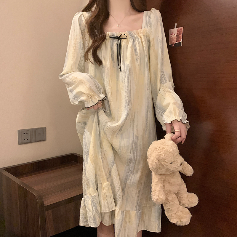 公主风睡裙睡衣女梭织棉春夏季长袖带胸垫甜美条纹中长款家居服