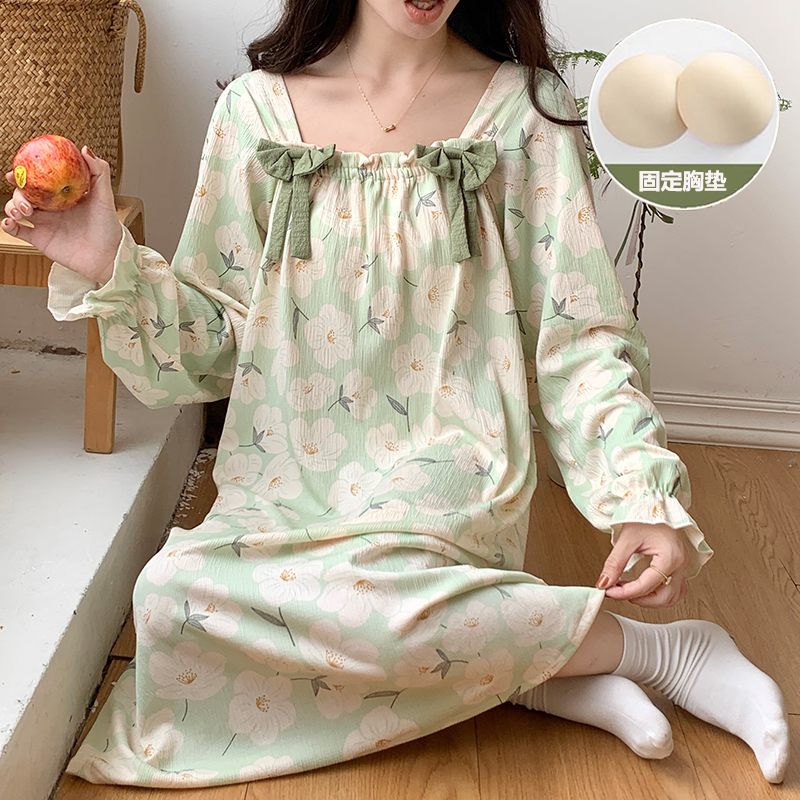 - XFS_D8877#长袖裙 绿色花朵 (带固定胸垫)