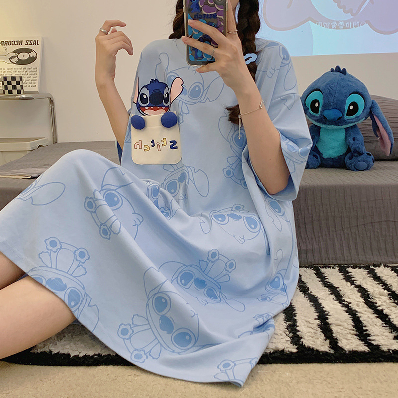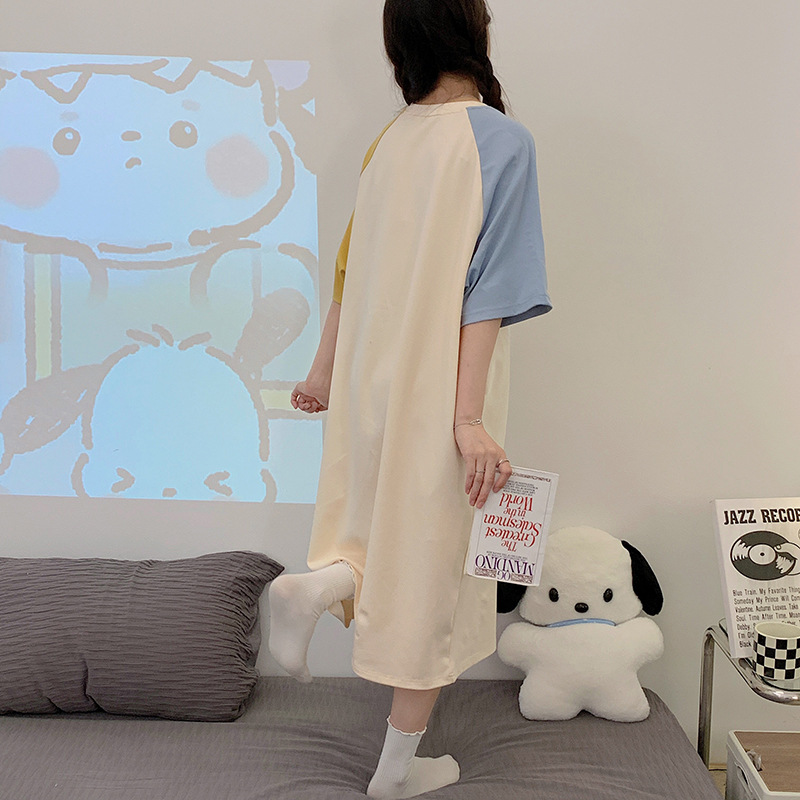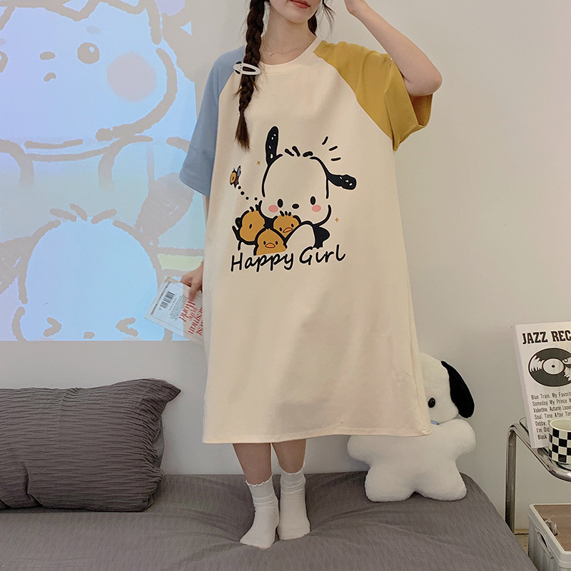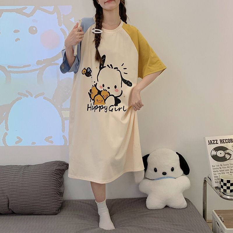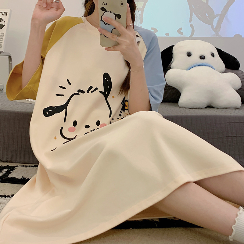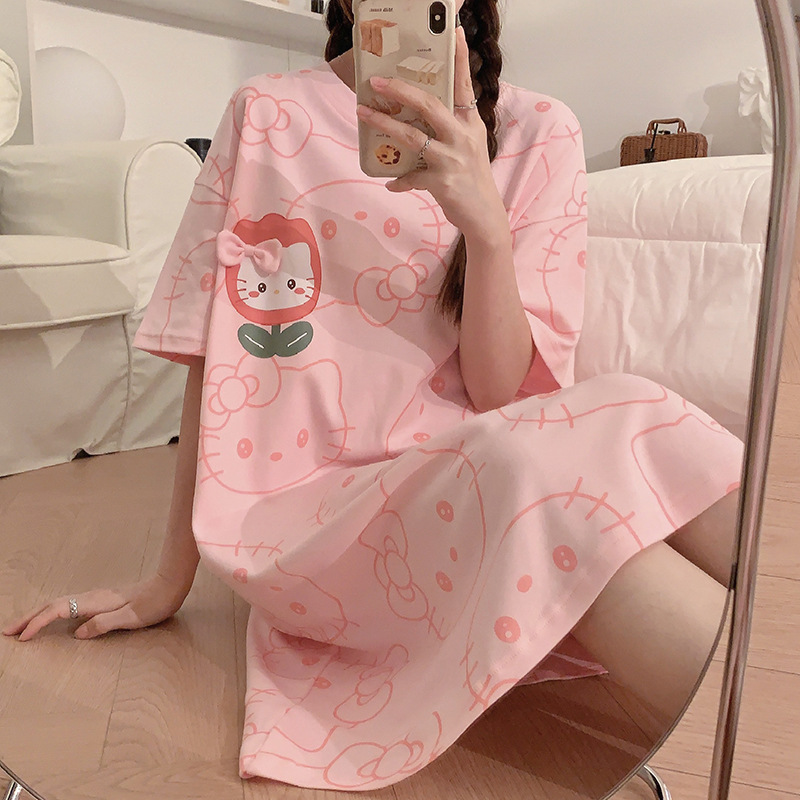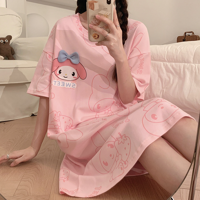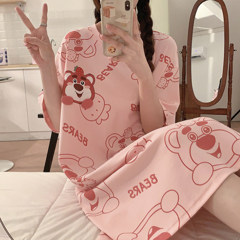 夏季短袖薄款睡裙女大码宽松可爱卡通棉质中长款可外穿家居服睡衣