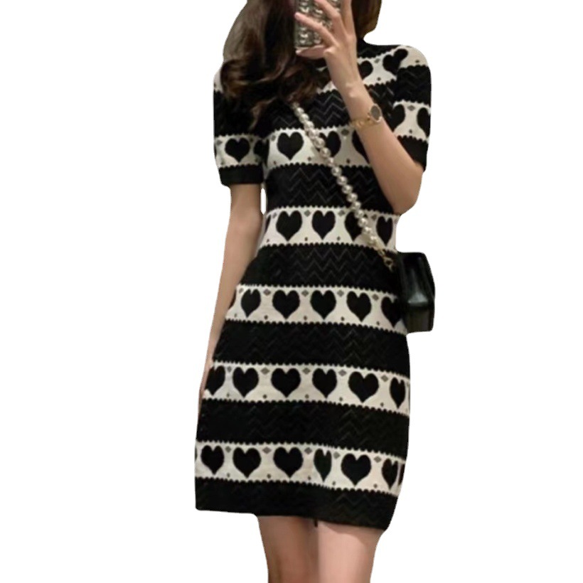 新款夏季时尚气质修身撞色心形收腰显瘦针织圆领短袖连衣裙女