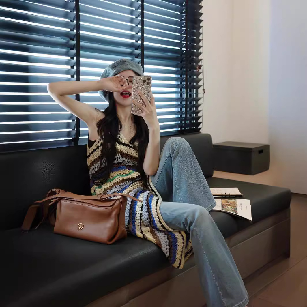 设计高级感撞色条纹镂空叠穿连衣裙夏季海边度假风镂空吊带长裙子