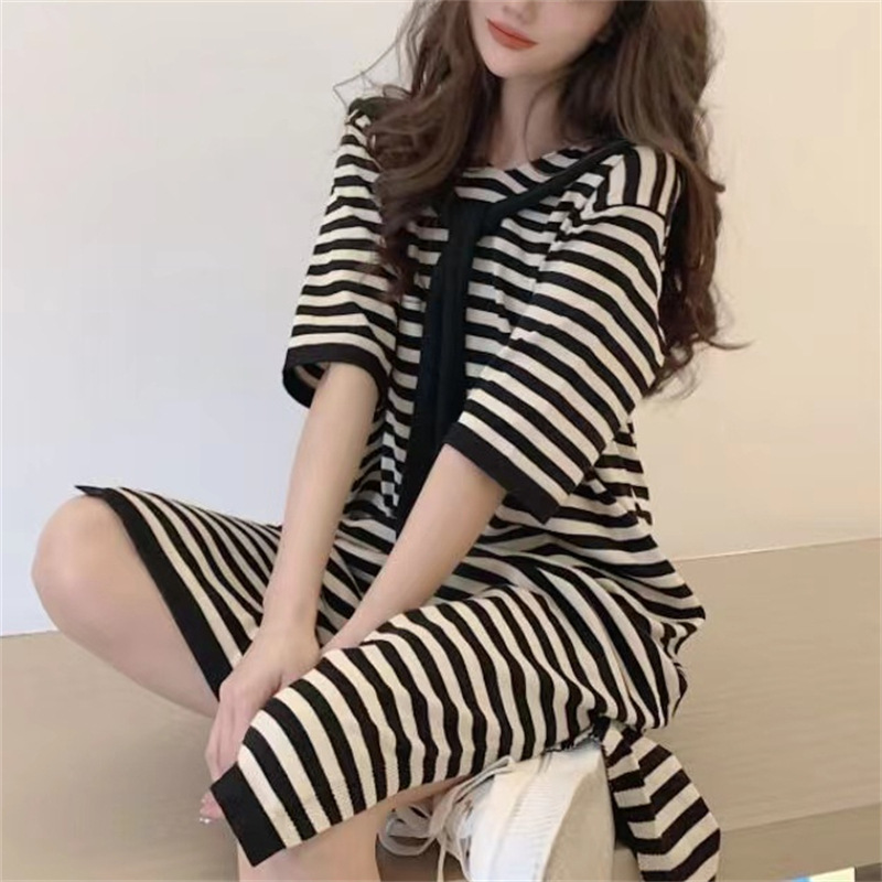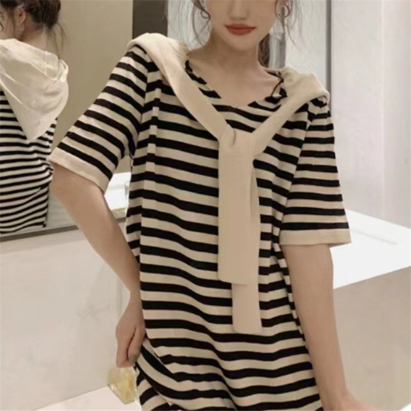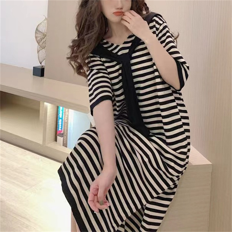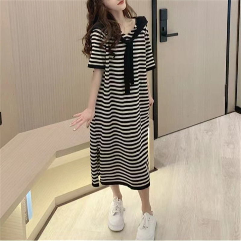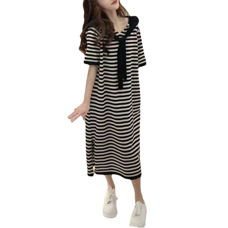 大码连衣裙200斤胖mm夏季条纹宽松显瘦短袖连帽中长款针织薄款裙