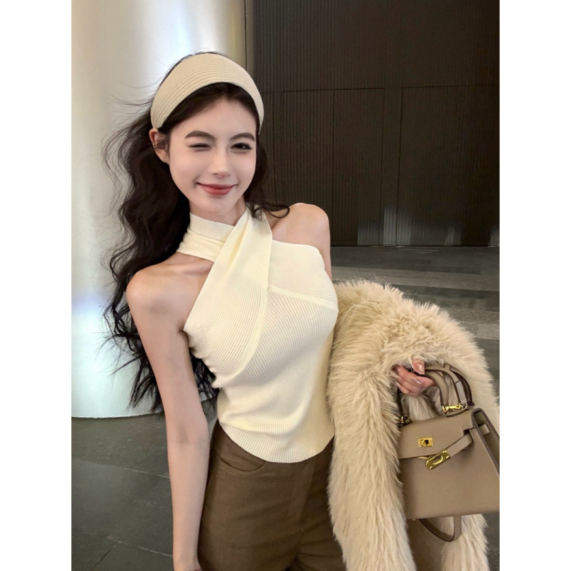 性感辣妹交叉扭结挂脖一字肩多种穿法针织毛背心内搭上衣