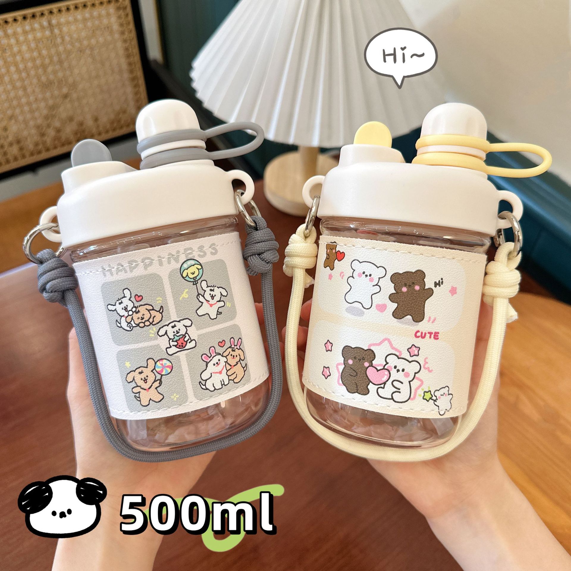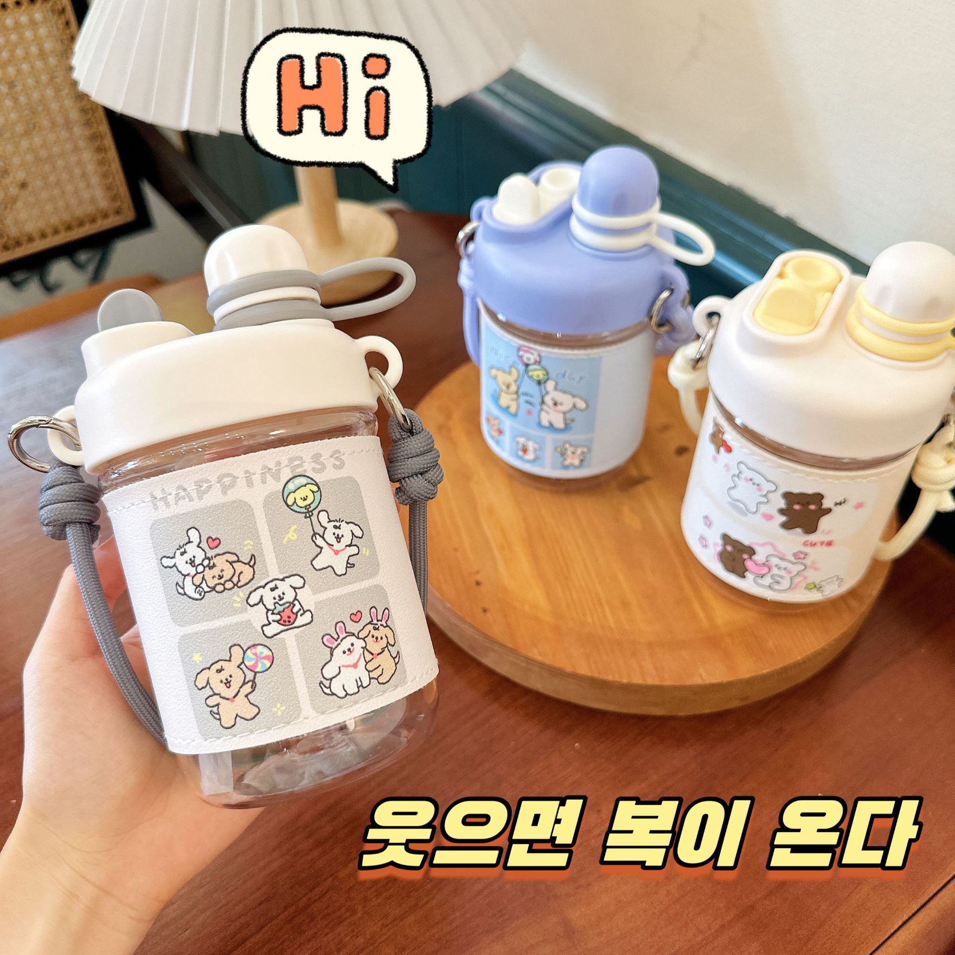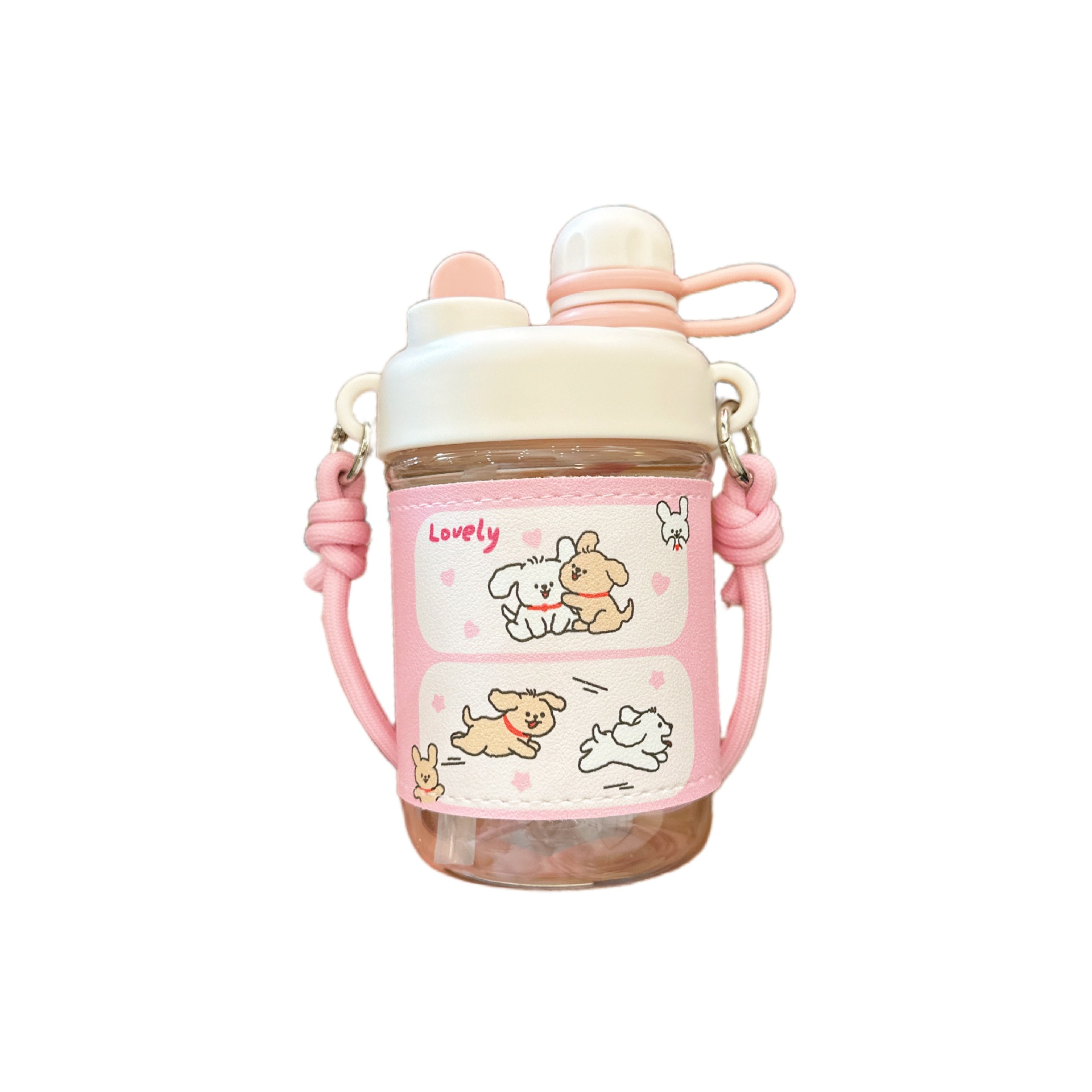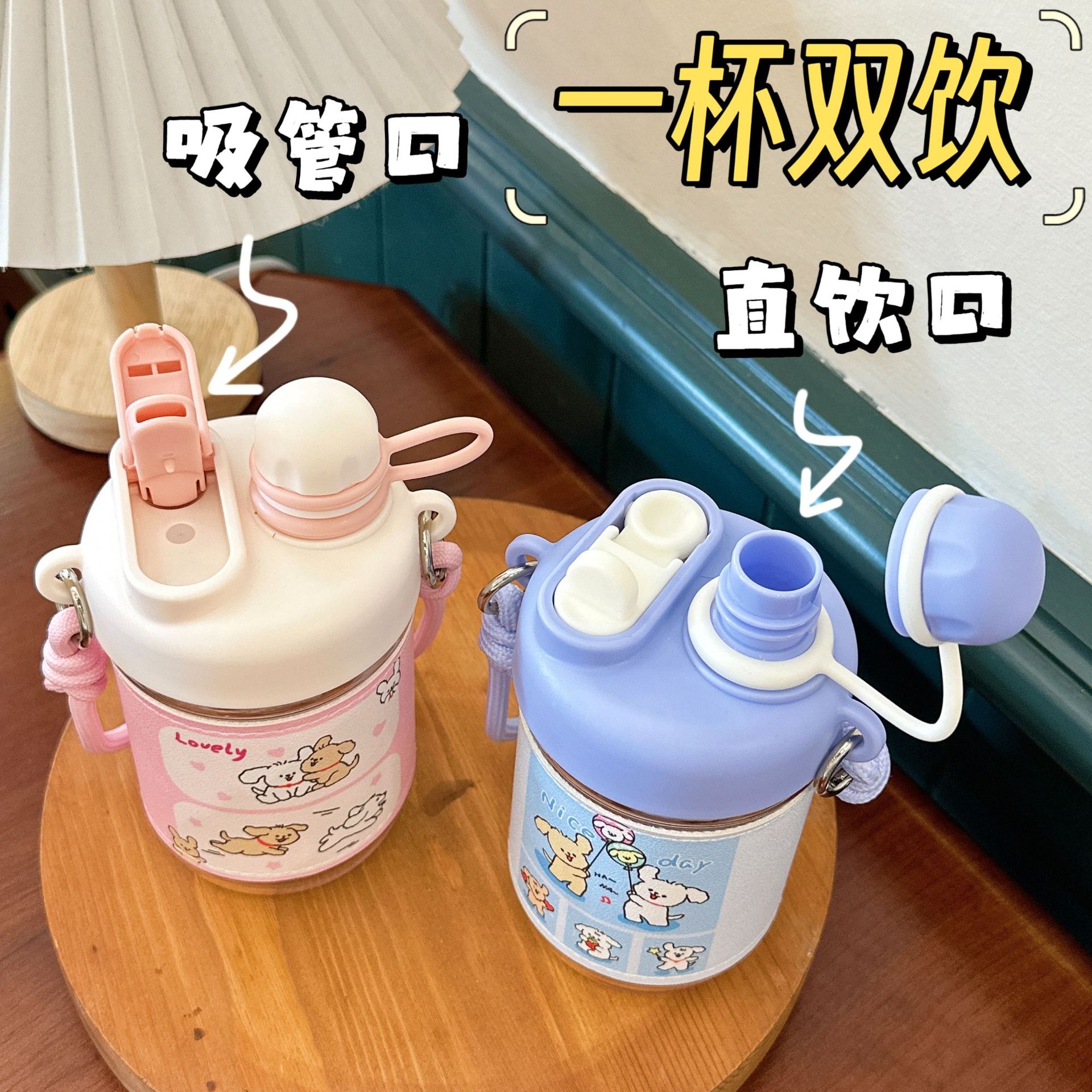 卡通皮套水杯可爱狗狗女生双饮吸管杯高颜值手提便携学生塑料杯