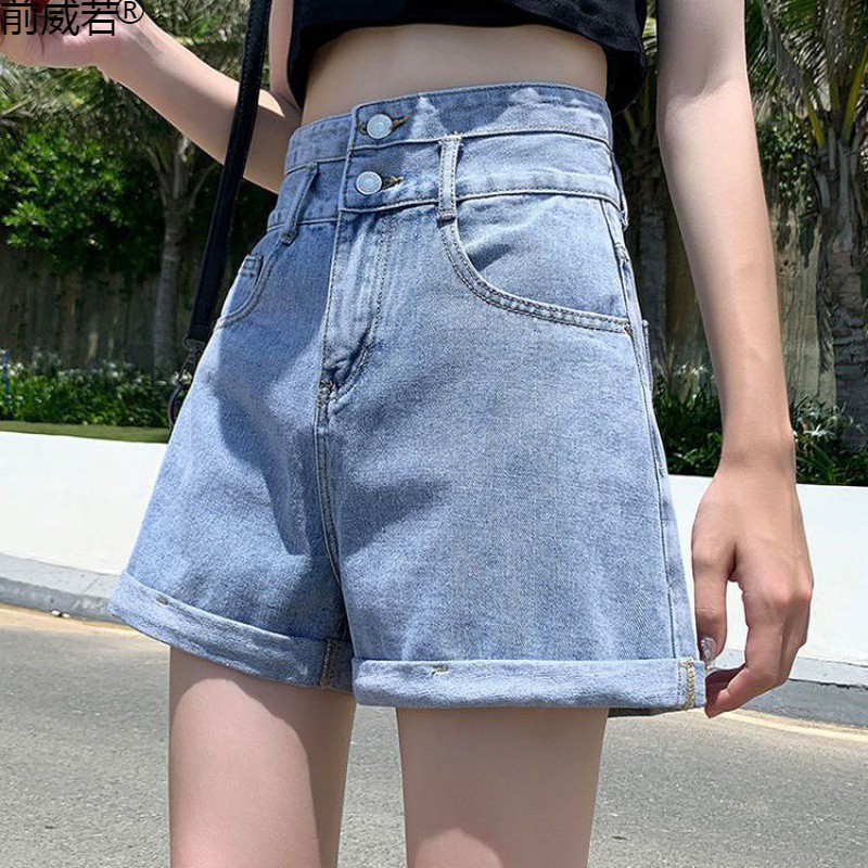 新款牛仔短裤女高腰阔腿裤 双排扣卷边女短裤夏天黑色字裤薄威