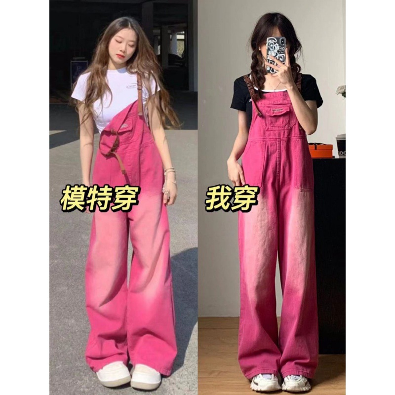 美式复古玫红色背带牛仔裤女春夏新款街头宽松百搭直筒拖地裤子潮