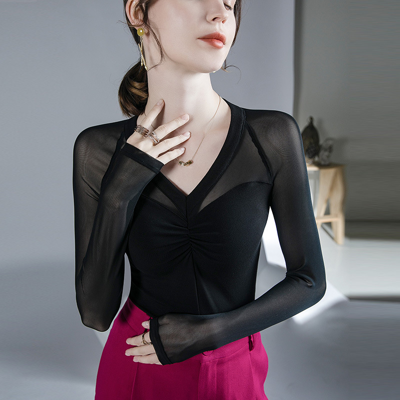 网纱微透上衣春秋新款内搭打底衫气质欧货小衫弹力