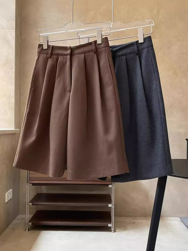 卢浮春季新品韩版简约毛呢双褶西装中裤A字显瘦高腰休闲五分裤女