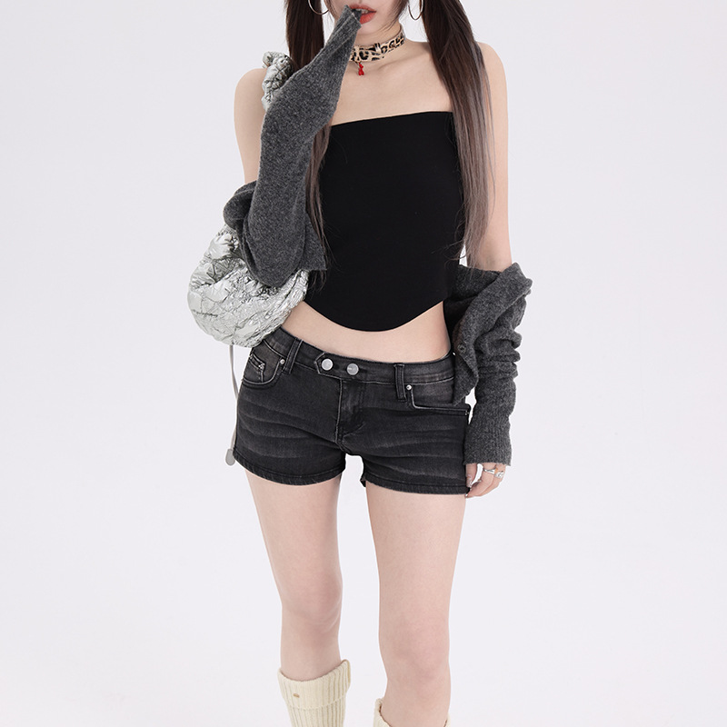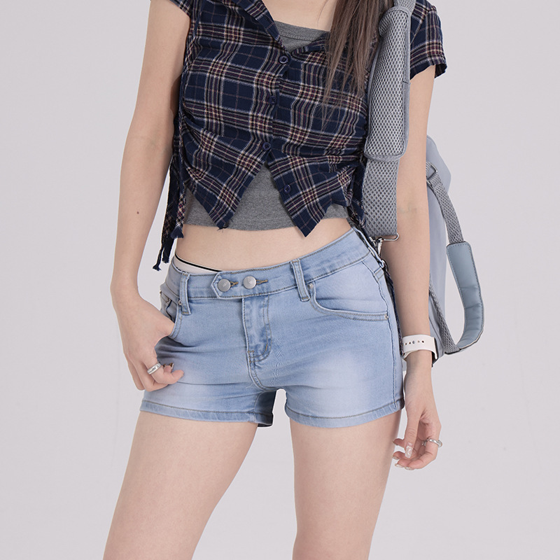 【今茵】性感辣妹夏日短裤低腰双扣弹力舒适牛仔短裤 气泡蓝&砂灰