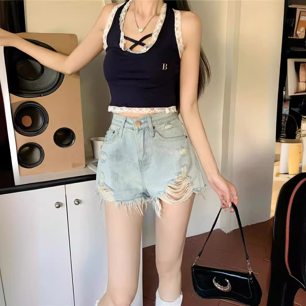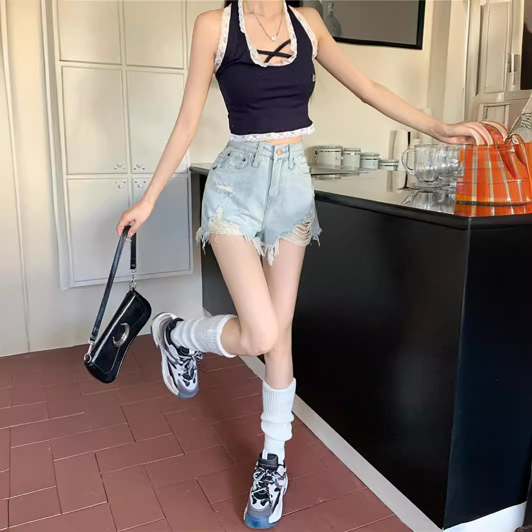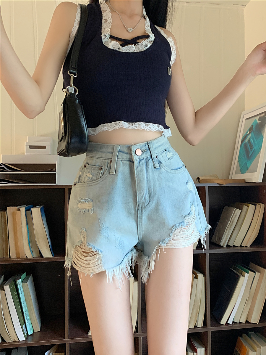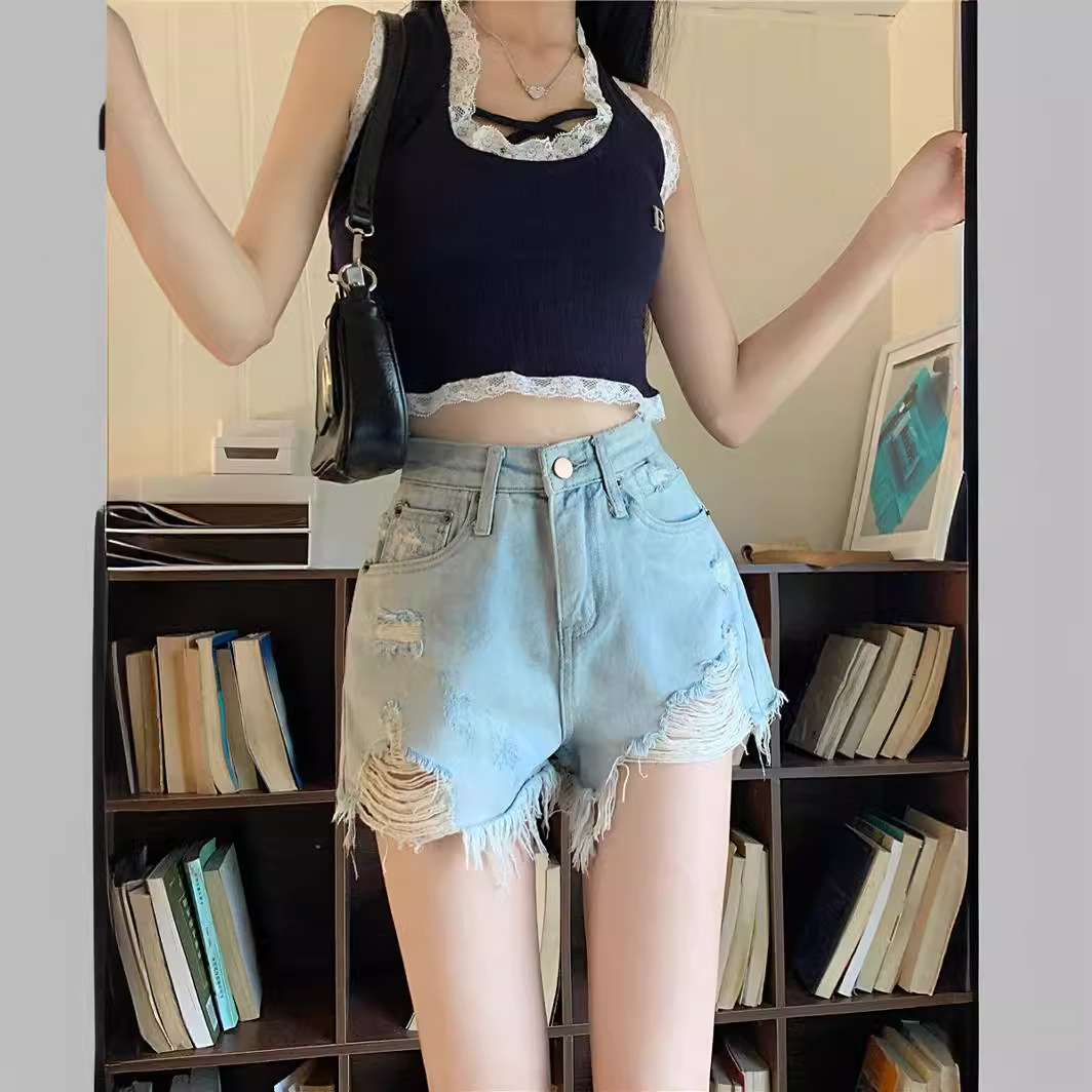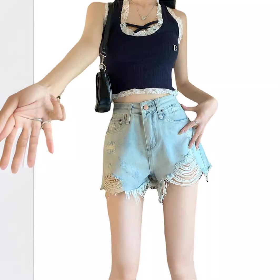 浅色毛边破洞牛仔短裤女夏天辣妹a字热裤小个子高腰显瘦阔腿裤子