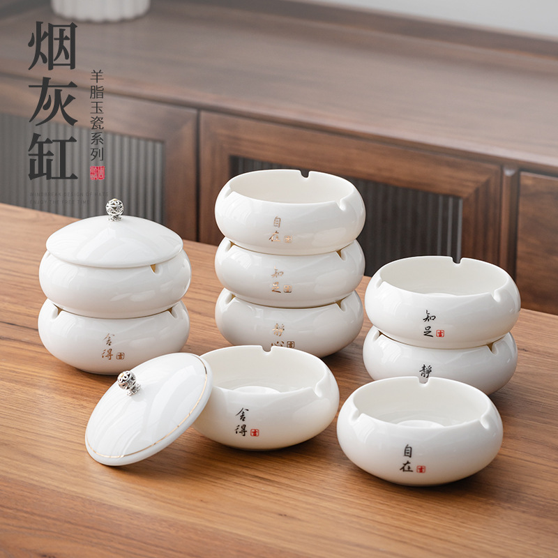 羊脂玉白瓷烟灰缸创意现代轻奢个性潮流办公室客厅家用带盖防飞灰