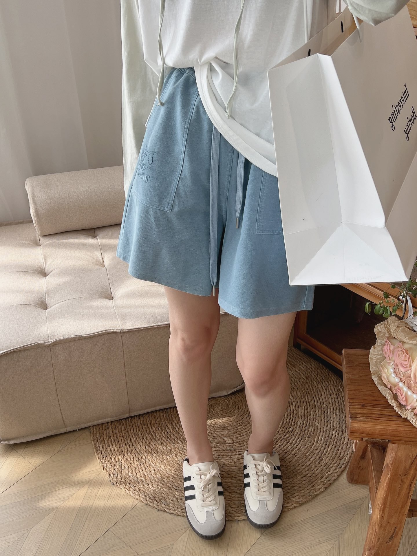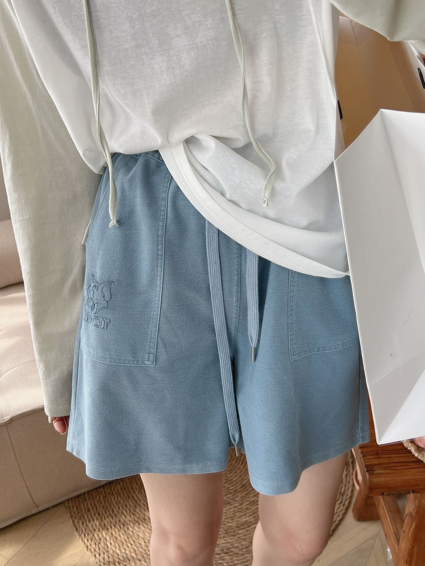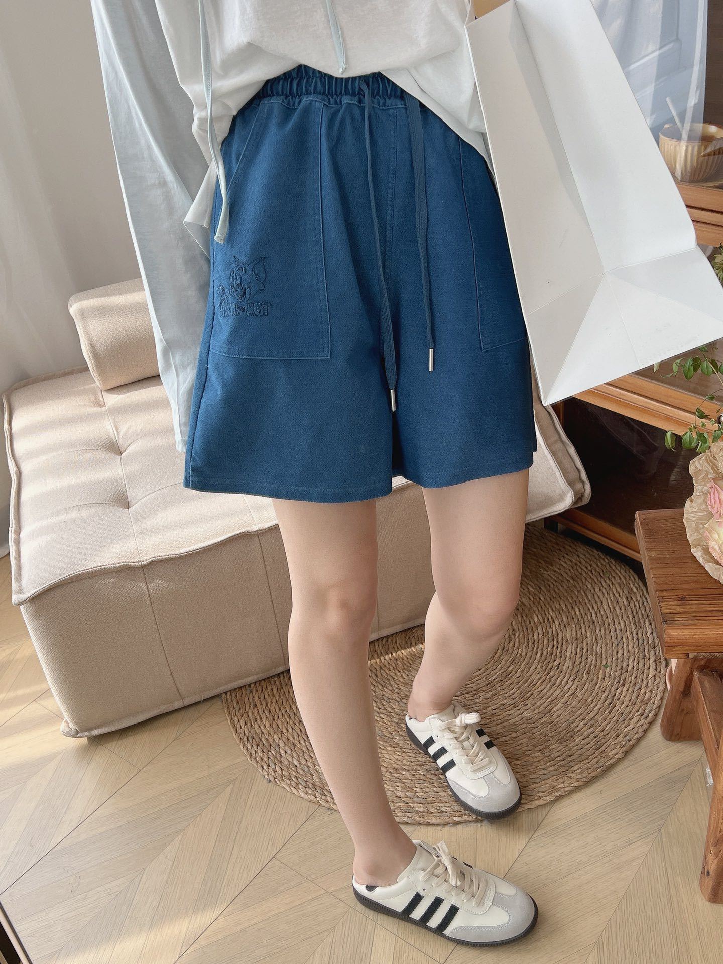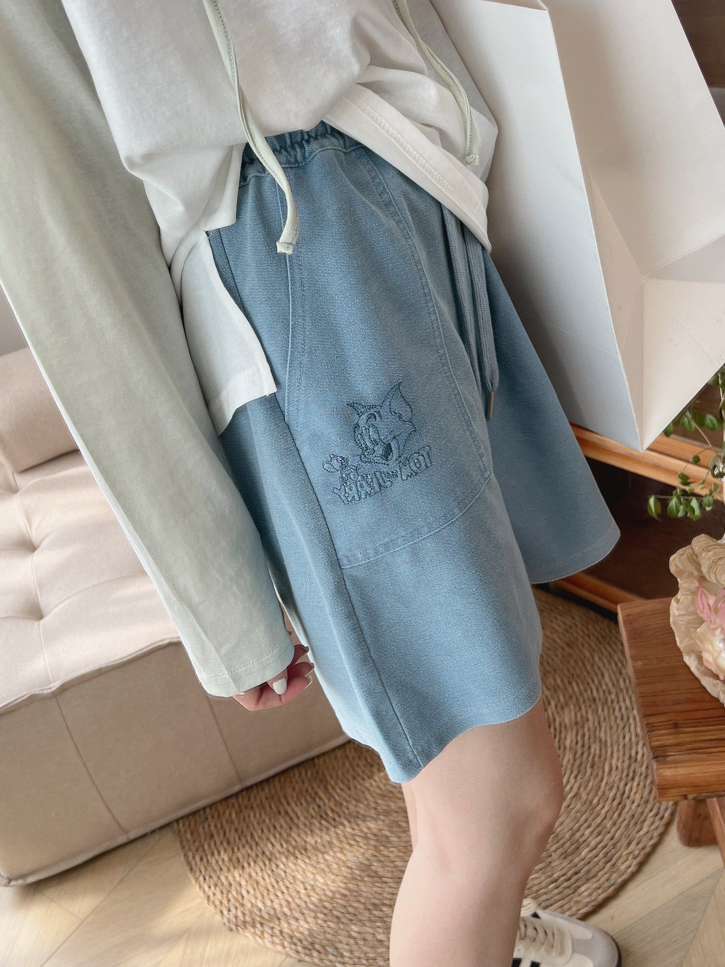 夏季新款女卡通猫和老鼠刺绣牛仔短裤高腰显瘦宽松休闲阔腿五分裤