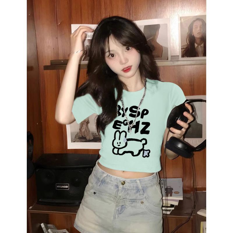 薄荷绿色正肩短袖t恤女夏季修身收腰显瘦设计感小众辣妹短款上衣