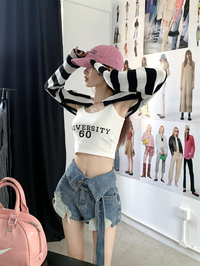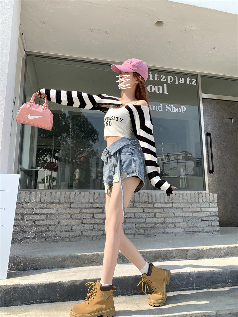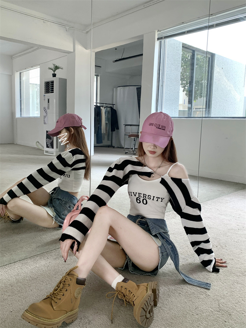 多巴胺彩虹条纹正肩短袖T恤女短款甜美学院风减龄上衣ins夏季新款