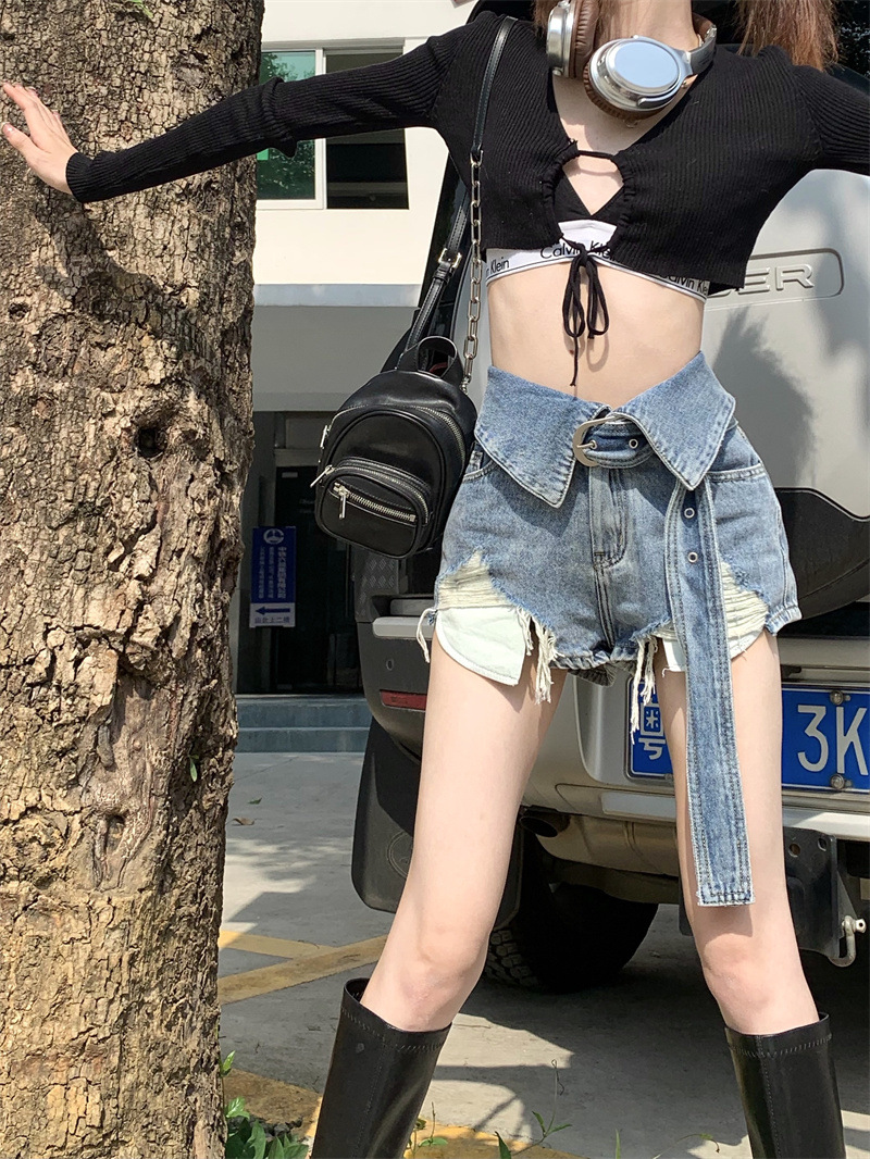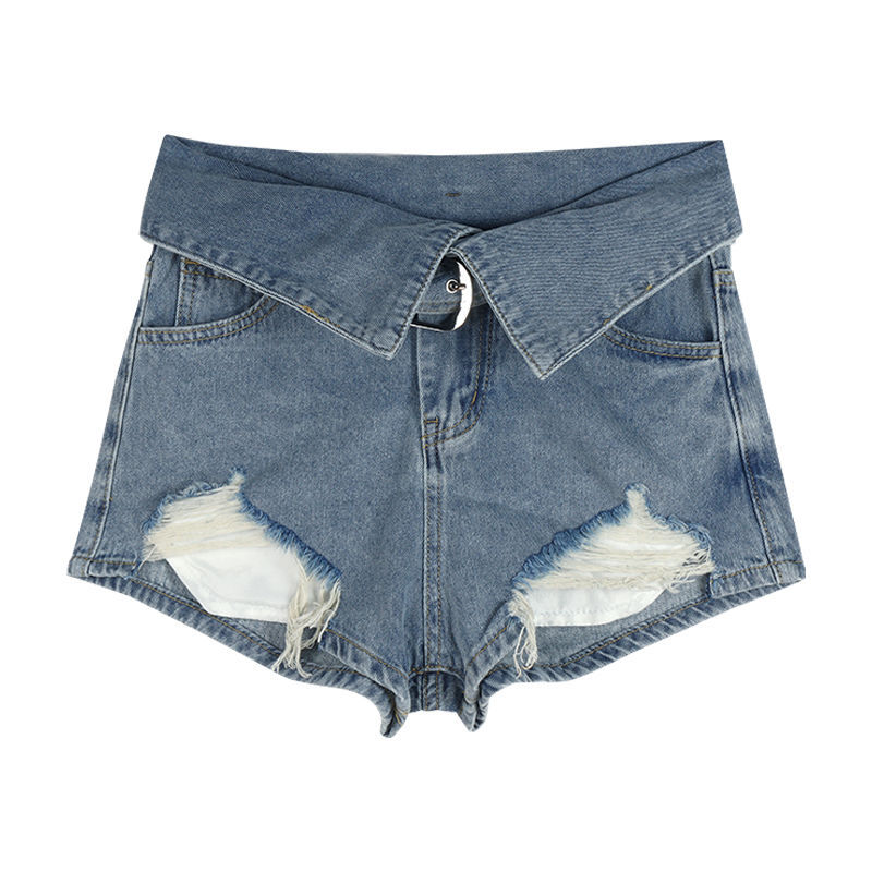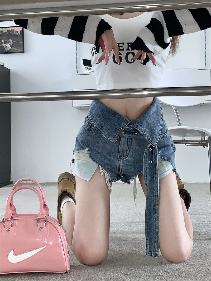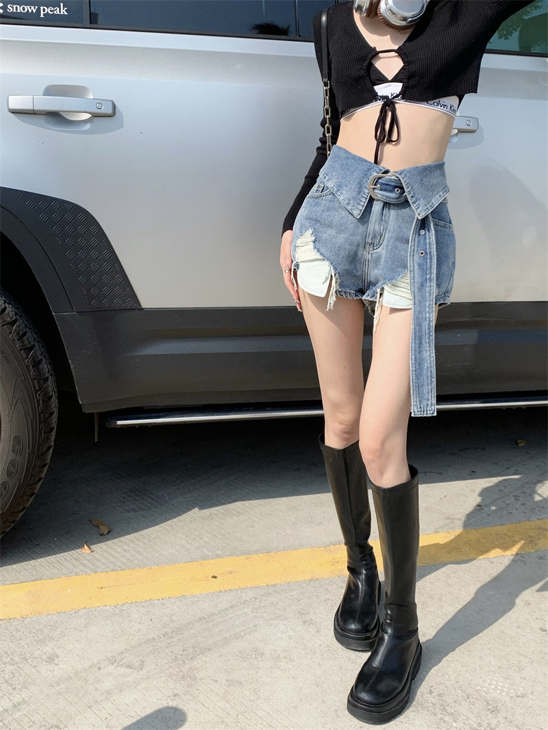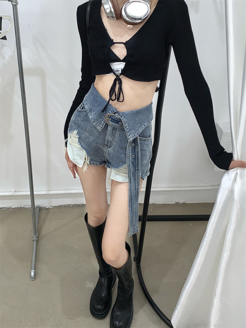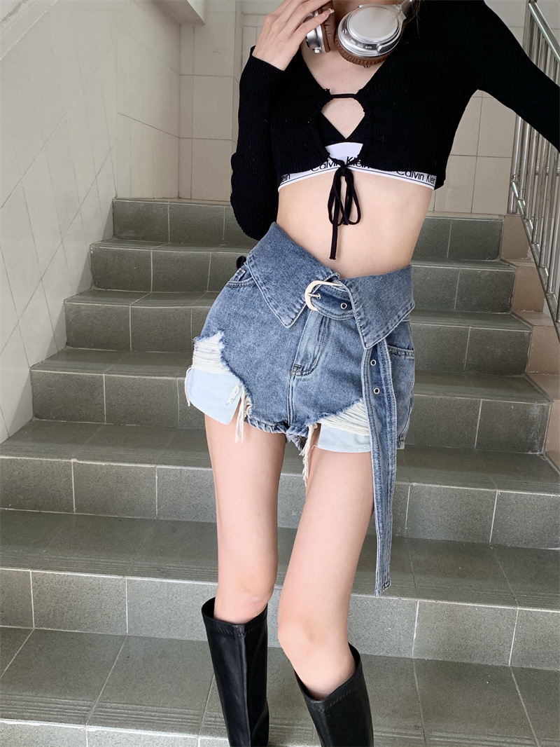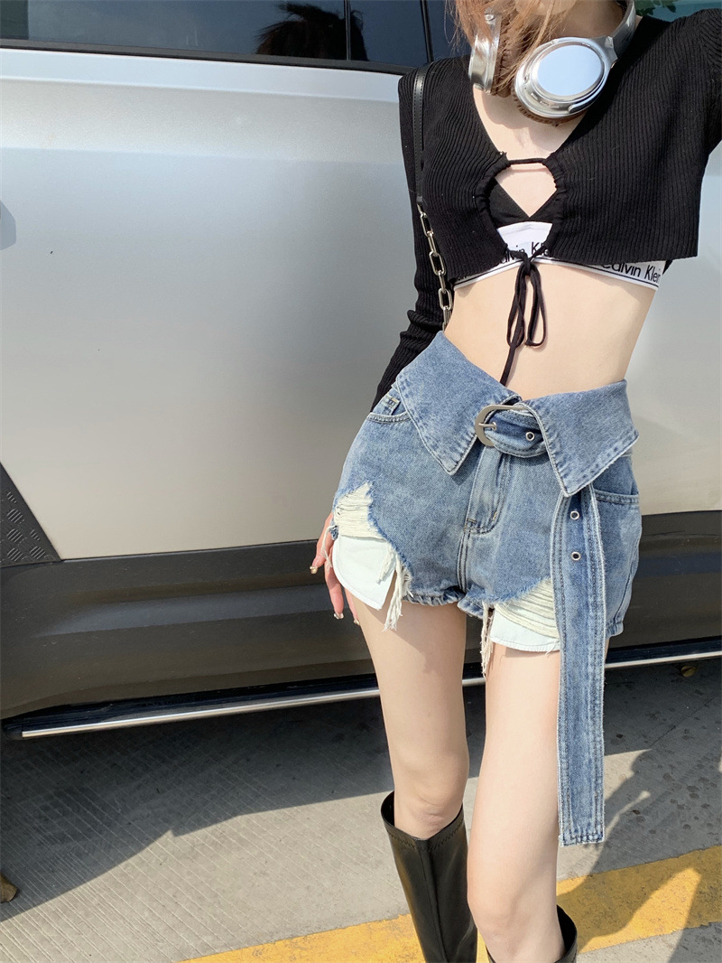 辣妹复古破洞牛仔裤女春季ins潮短裤高腰显瘦设计感小众阔腿裤子