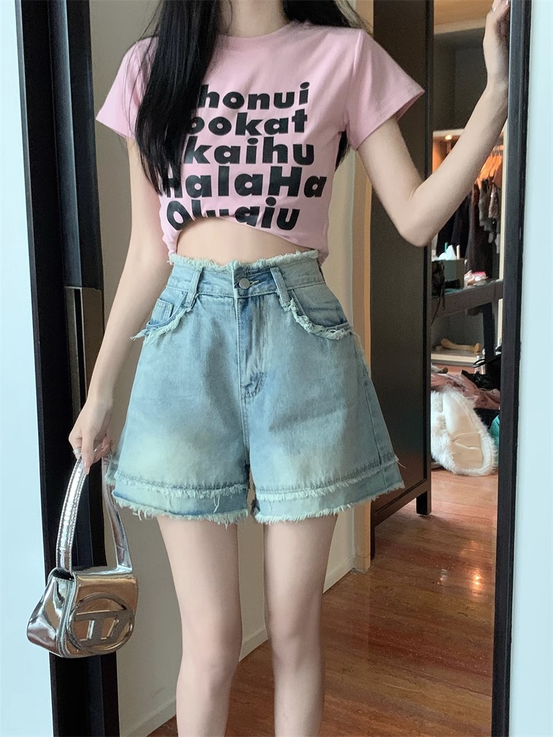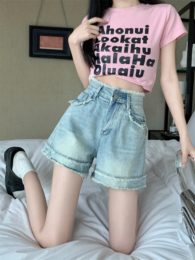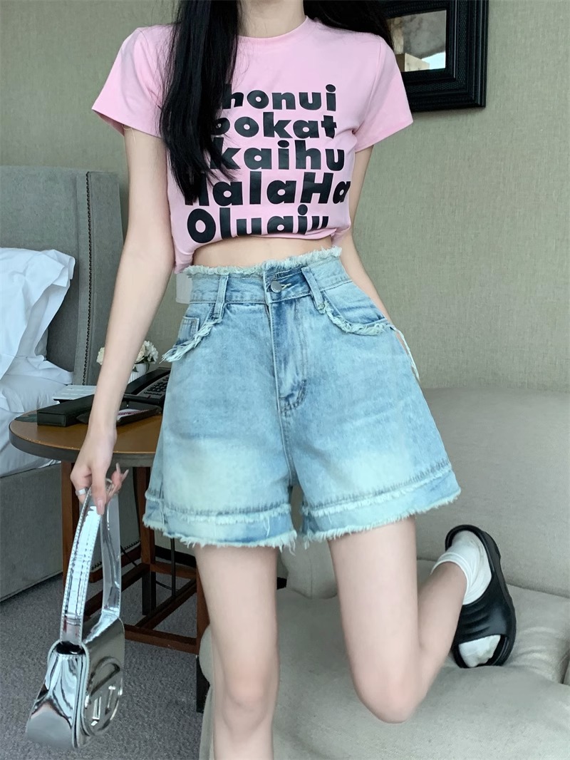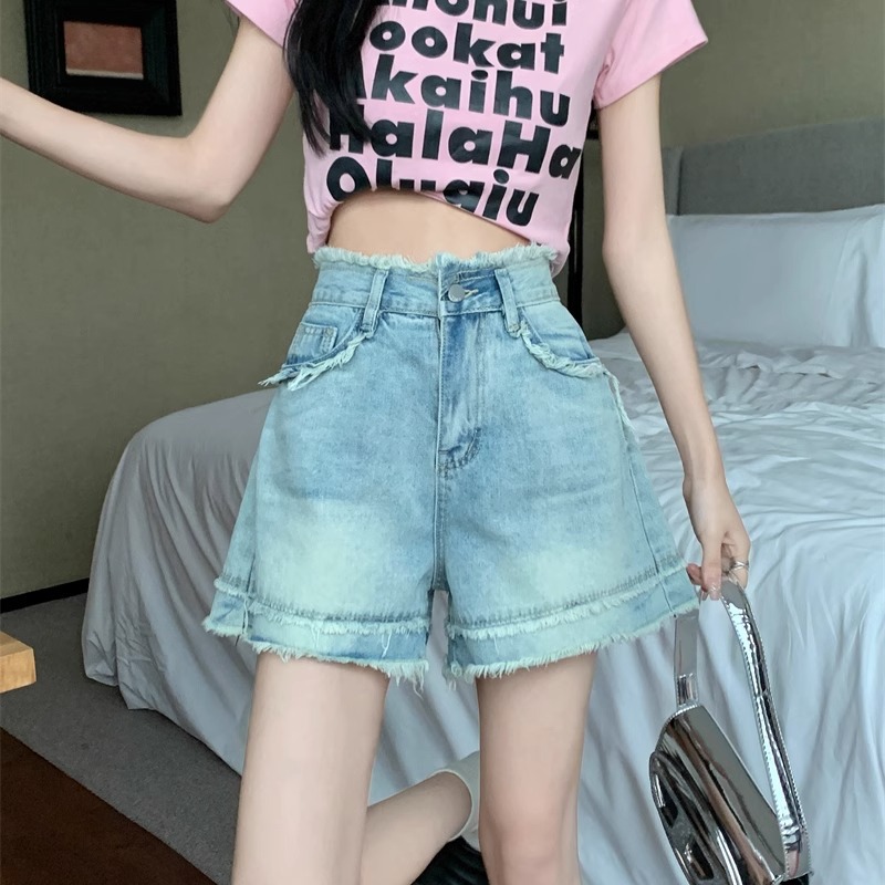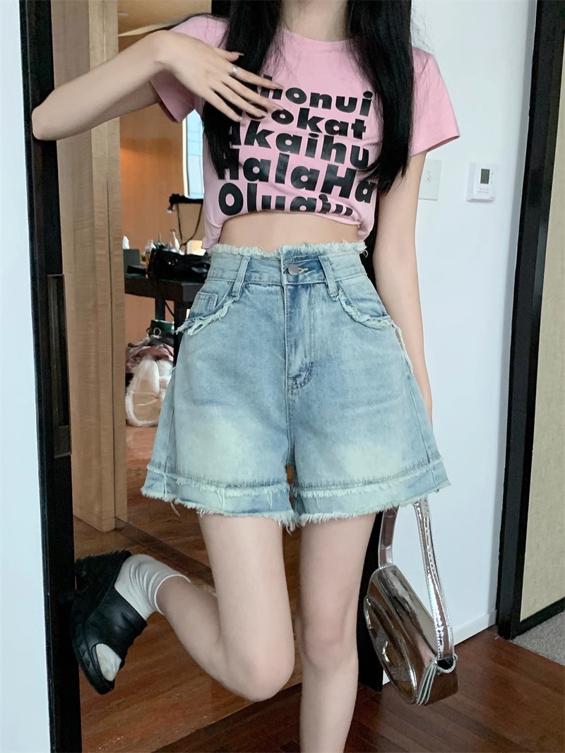 大码女装新款水洗毛边高腰牛仔短裤胖mm宽松阔腿显瘦a字辣妹热裤