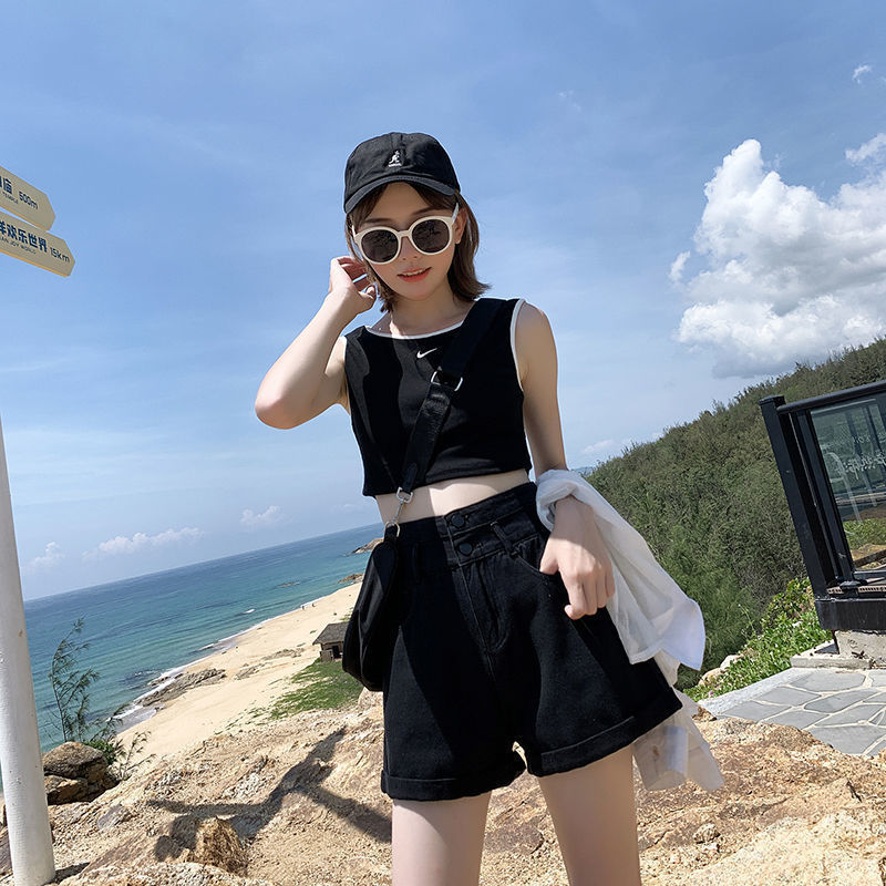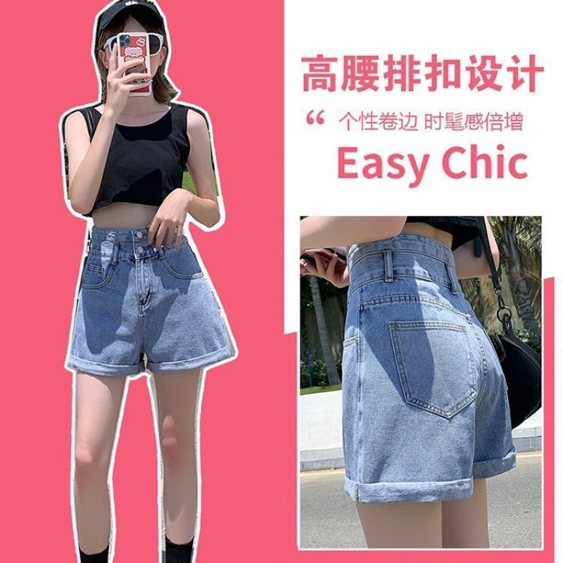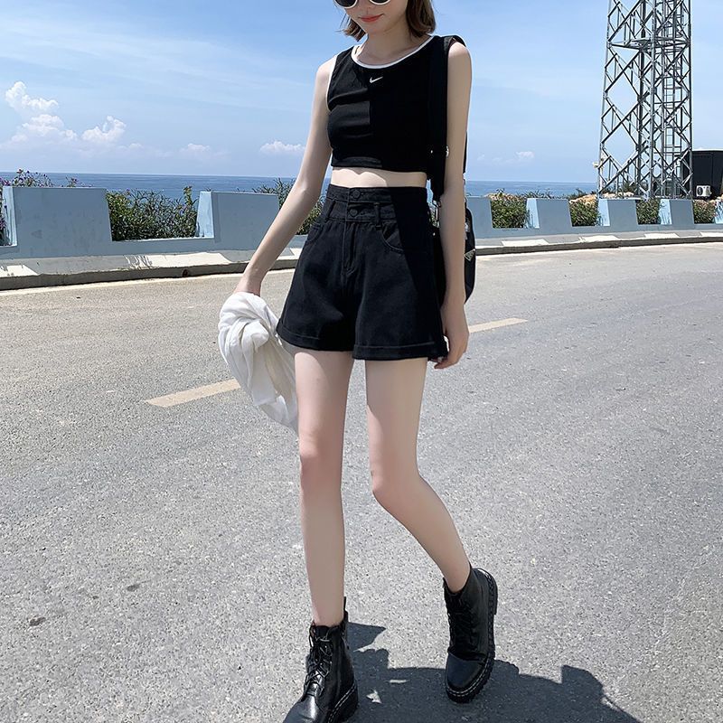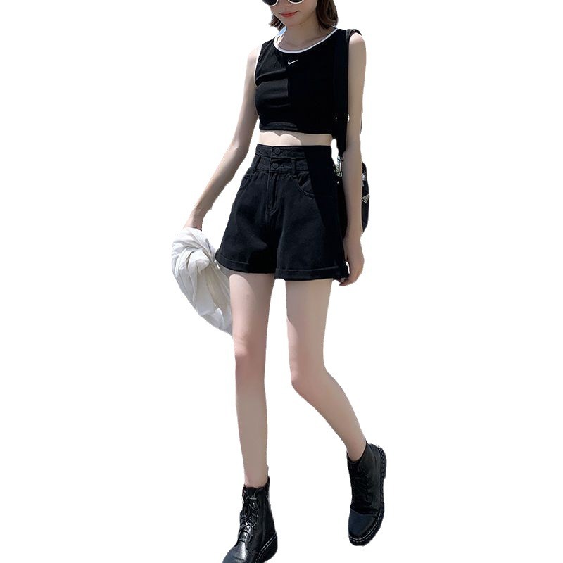 新款牛仔短裤女高腰显瘦阔腿裤 双排扣卷边女短裤夏天黑色a字裤薄
