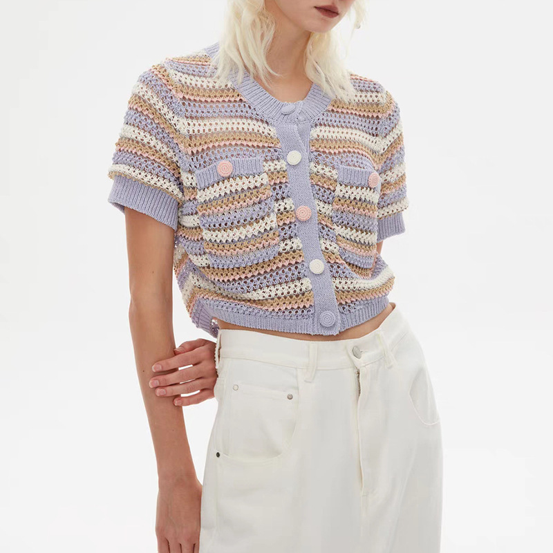 复古小香风镂空短袖针织开衫女夏小众设计感修身显瘦短款圆领上衣