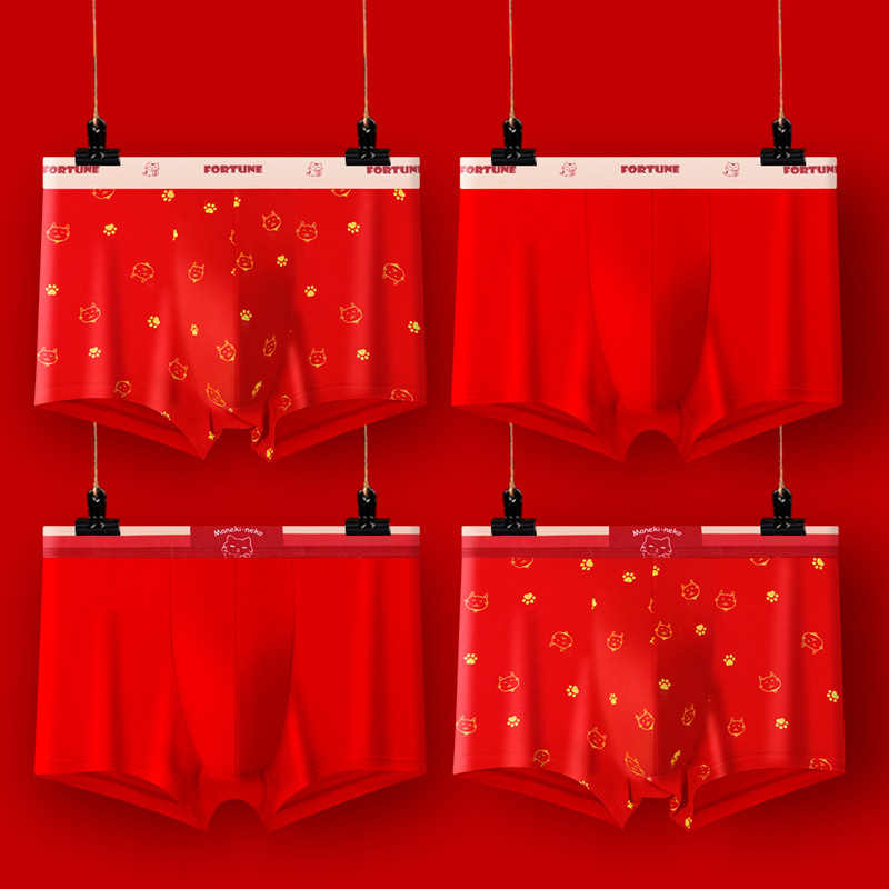 四条装男士内裤男生本命年纯棉大红色四角平角短7A级抗菌结婚底裤