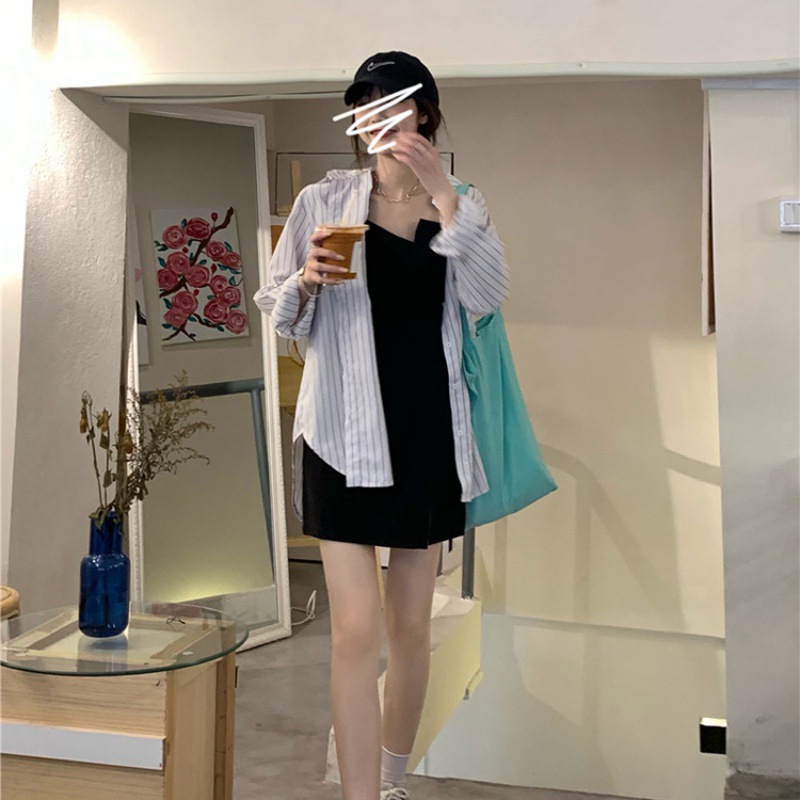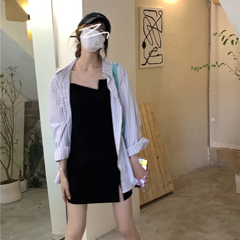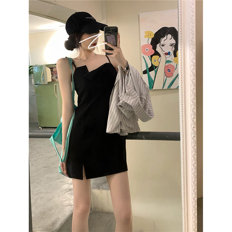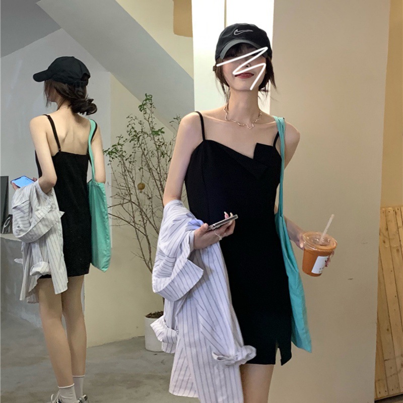 黑色吊带连衣裙女春装韩版新款辣妹设计感不规则显瘦打底裙子