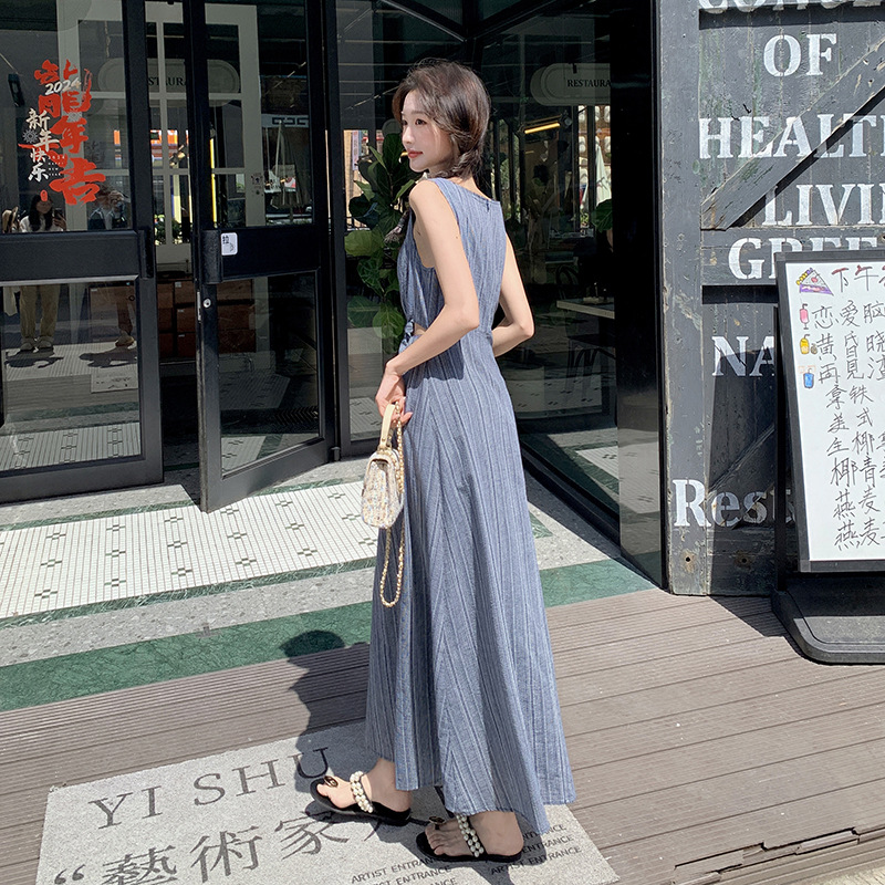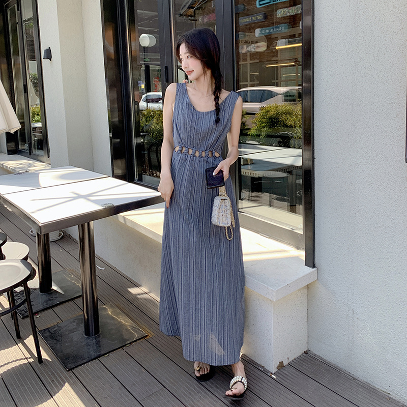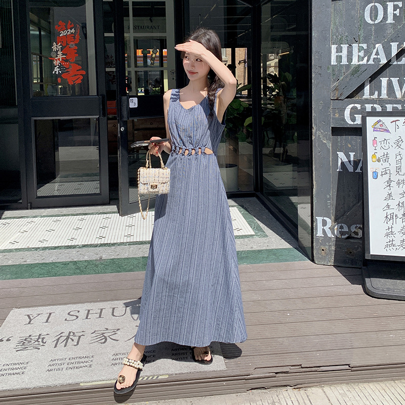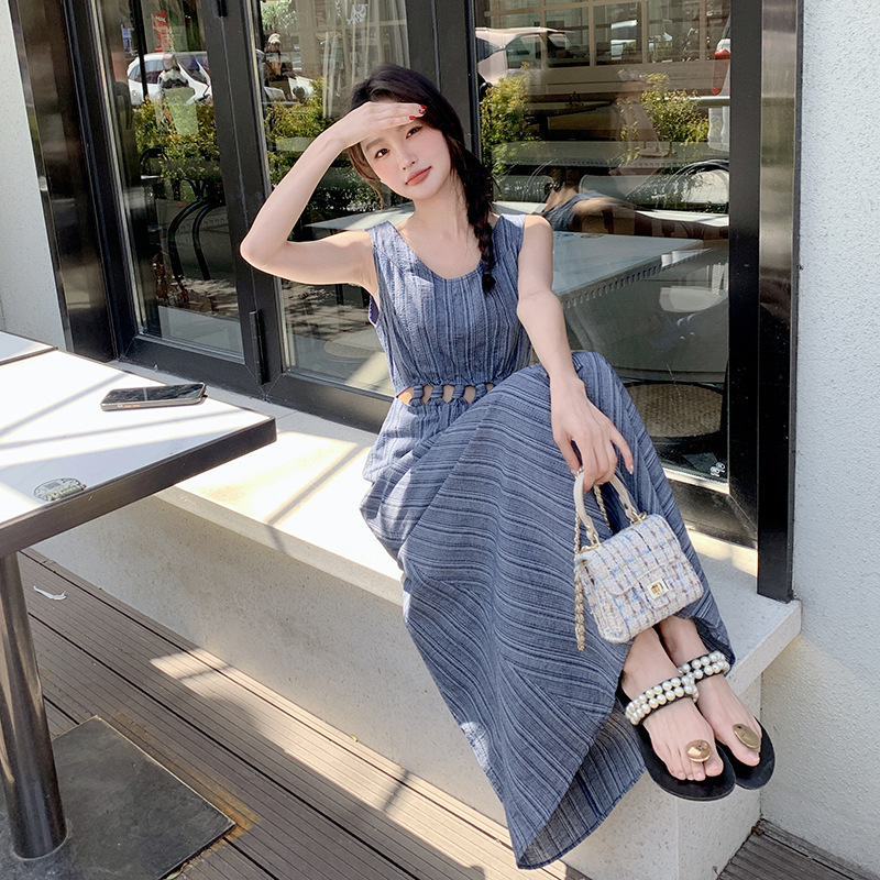 韩版镂空设计感小心机连衣裙夏圆领高腰显瘦气质竖条纹背带裙