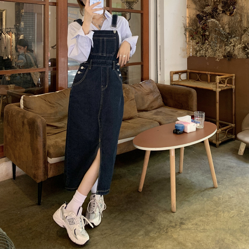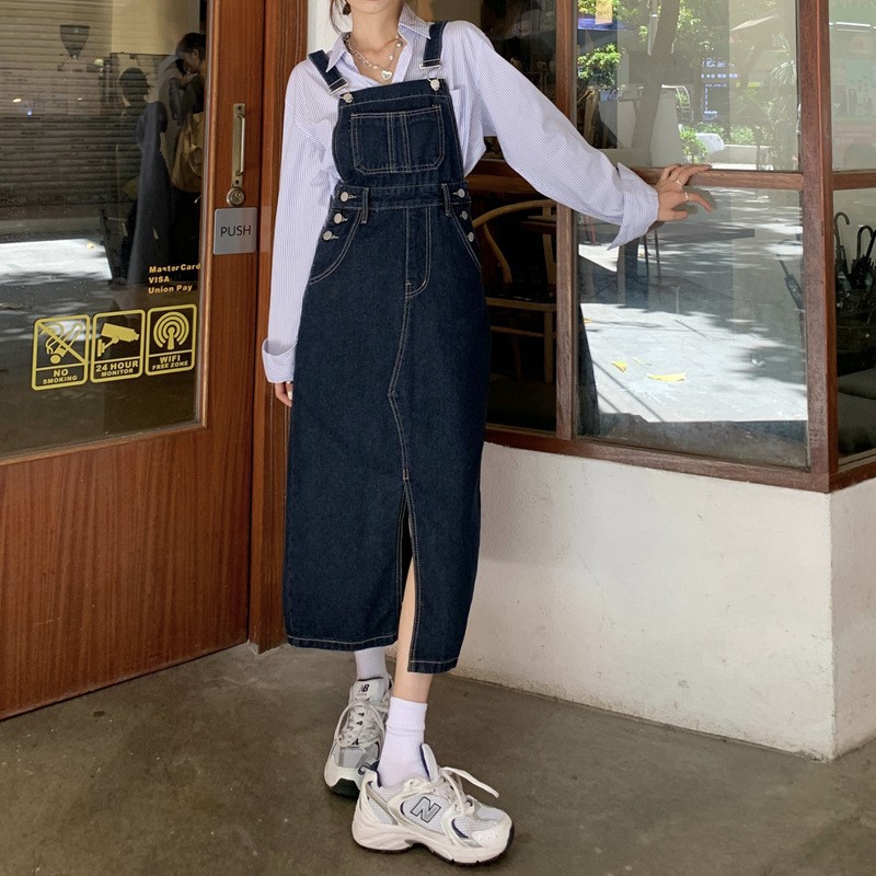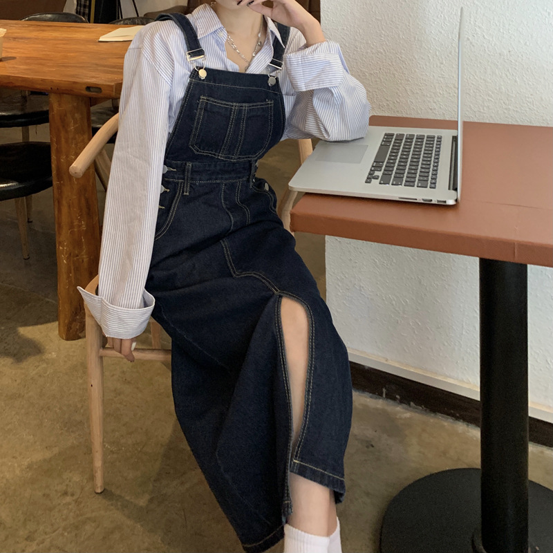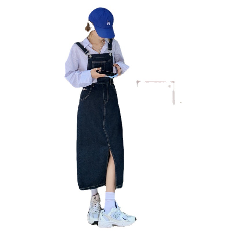 开叉背带裙女设计感小众春季韩版别致牛仔连衣裙港味可爱日系长裙