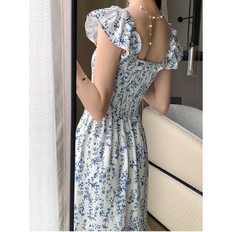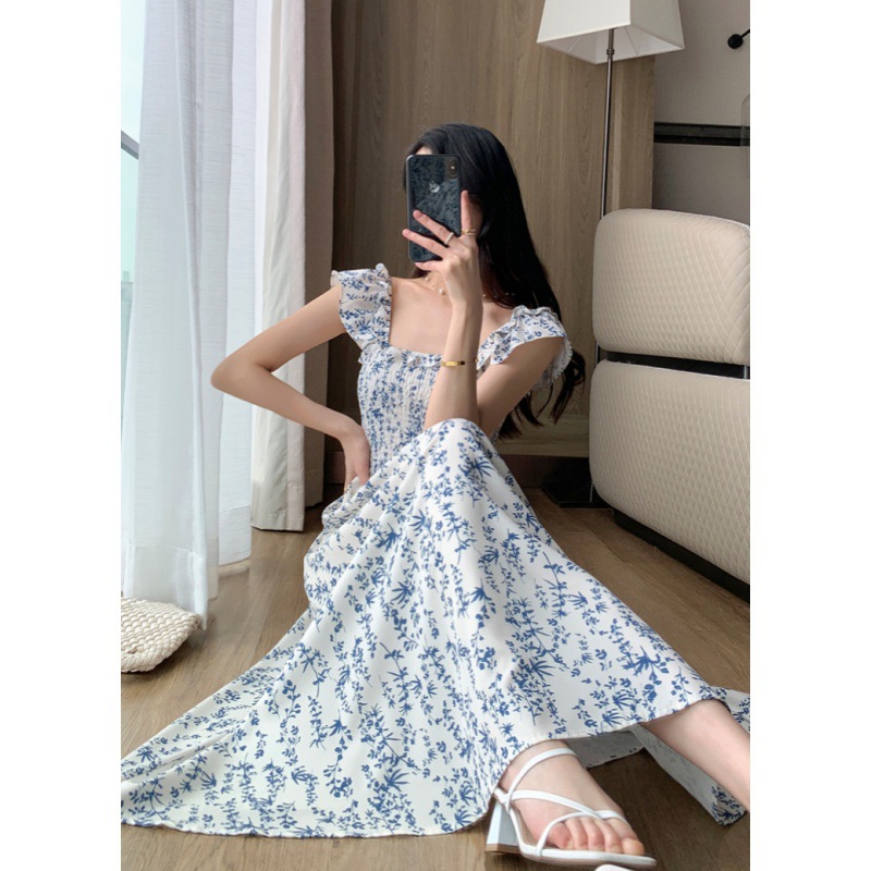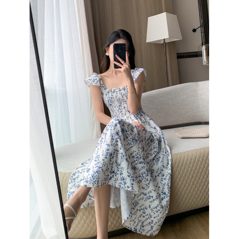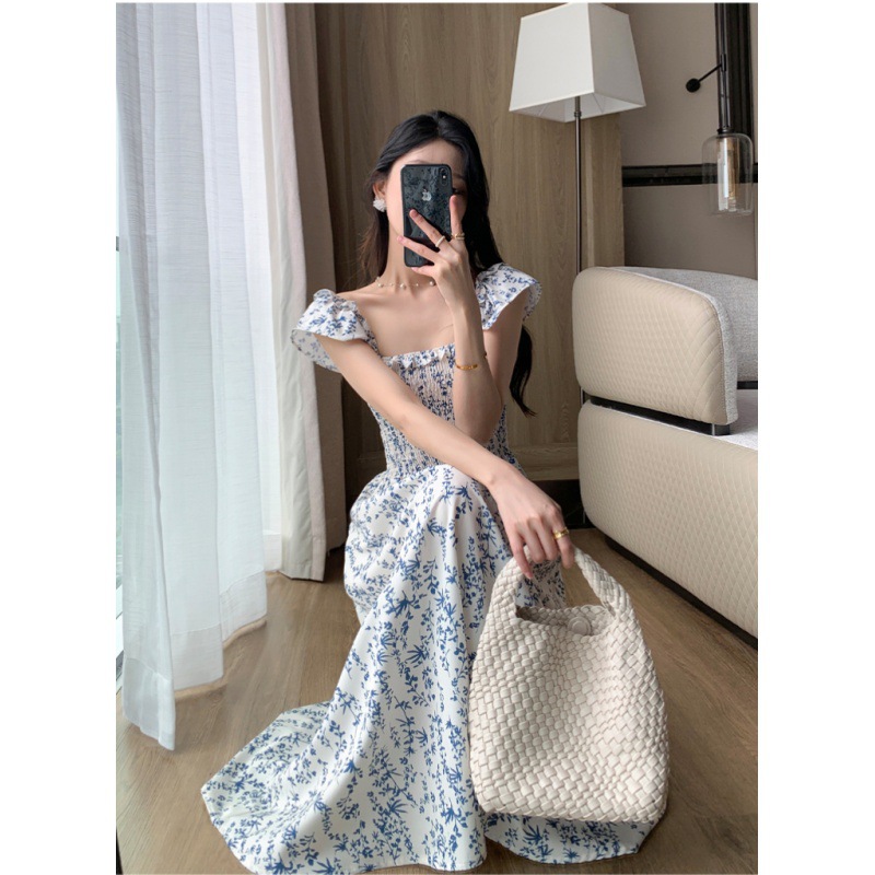 蓝色碎花连衣裙女夏季新款小飞袖法式茶歇收腰方领长裙子