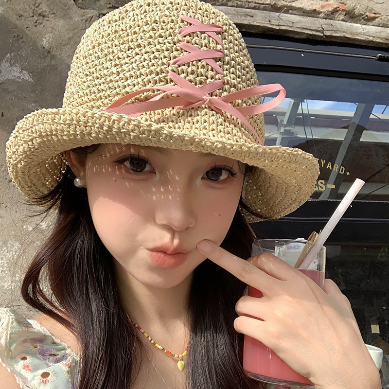 蝴蝶结绑带草帽女夏季可折叠草编大帽檐遮阳帽海边沙滩渔夫帽子潮