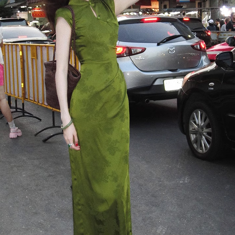 新中式两色提花显瘦显白旗袍连衣裙立领夏季