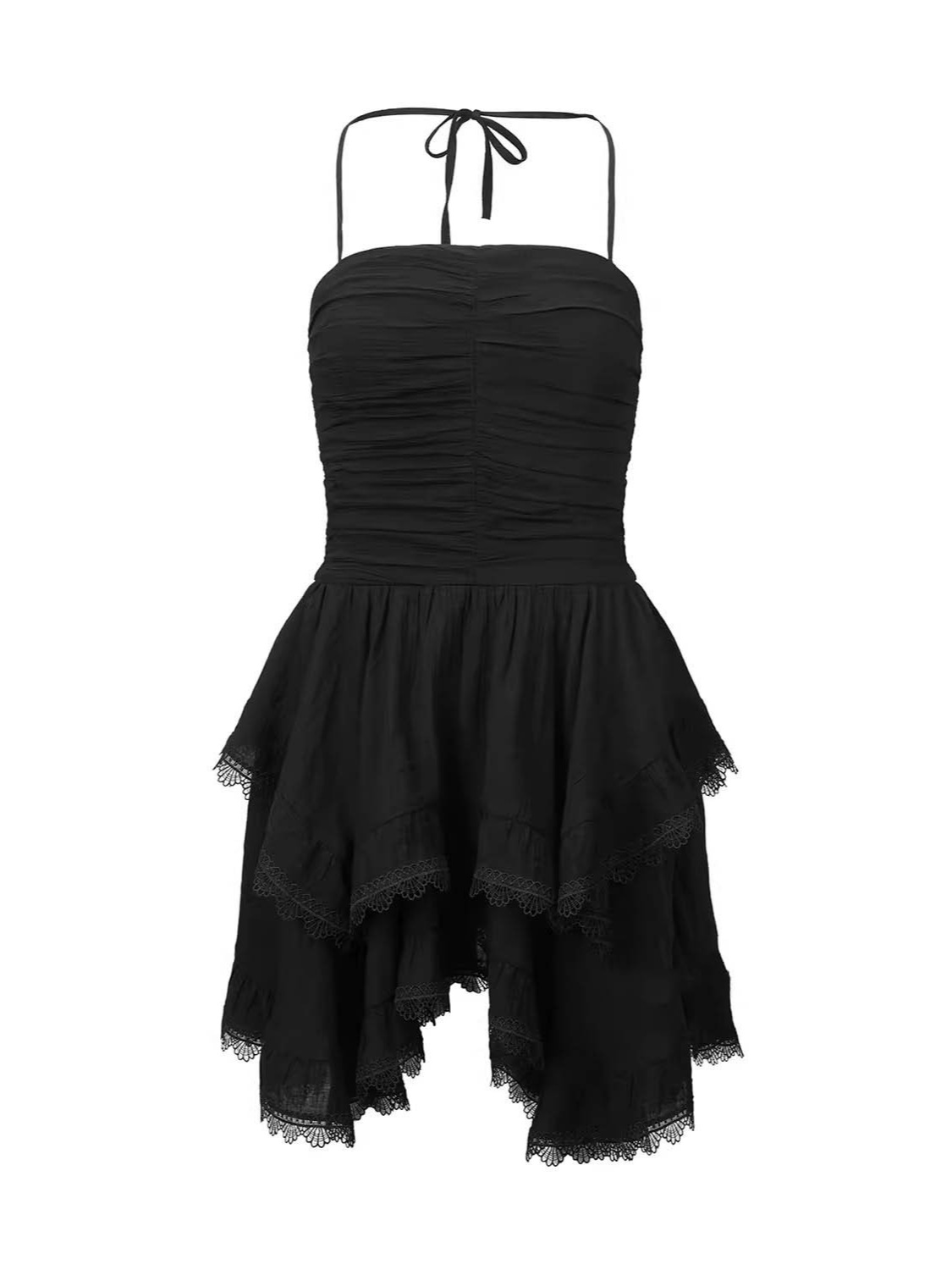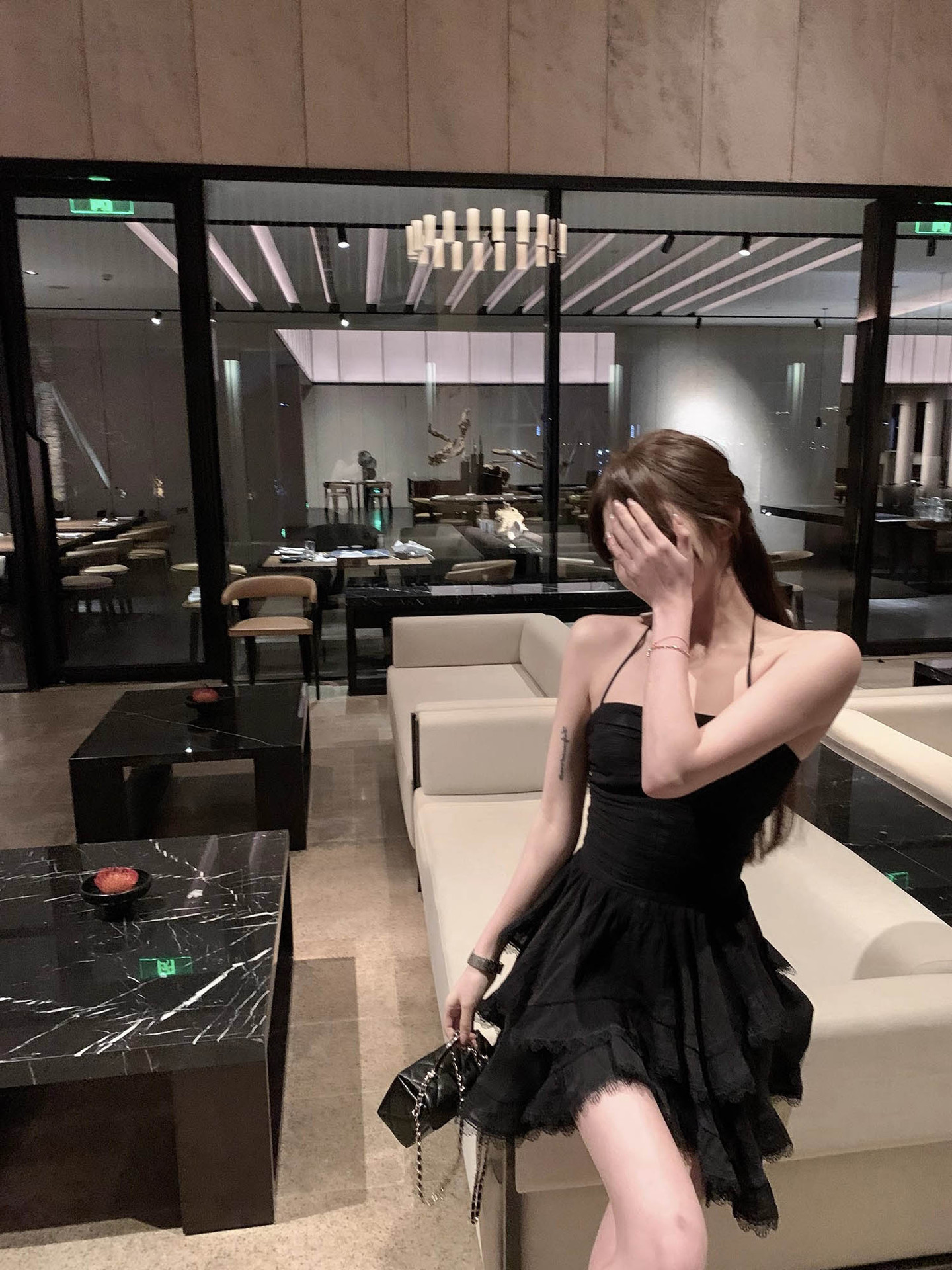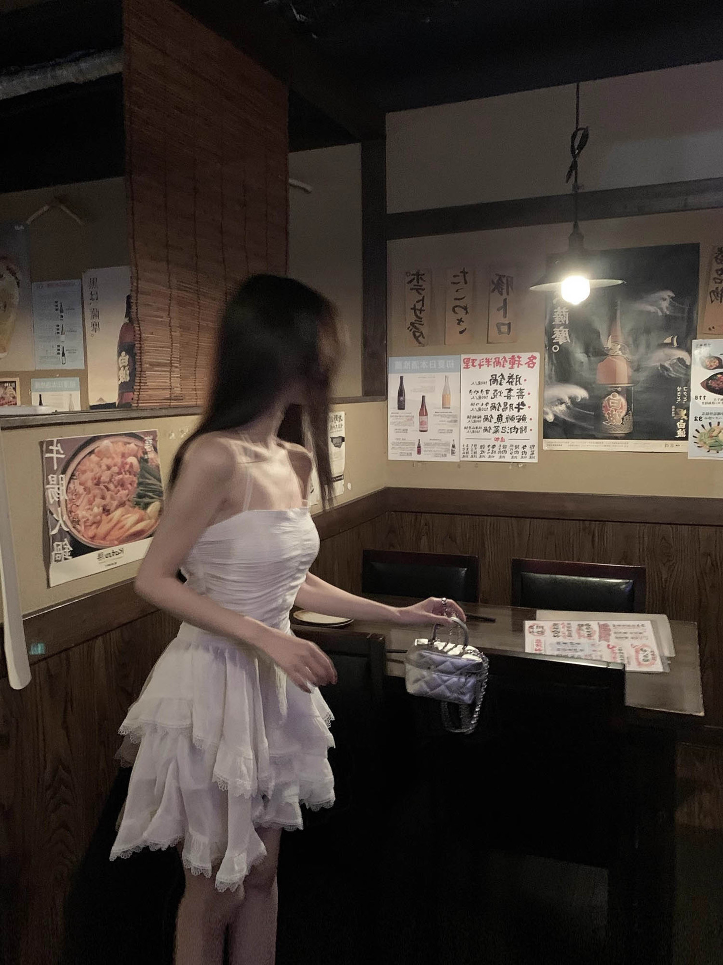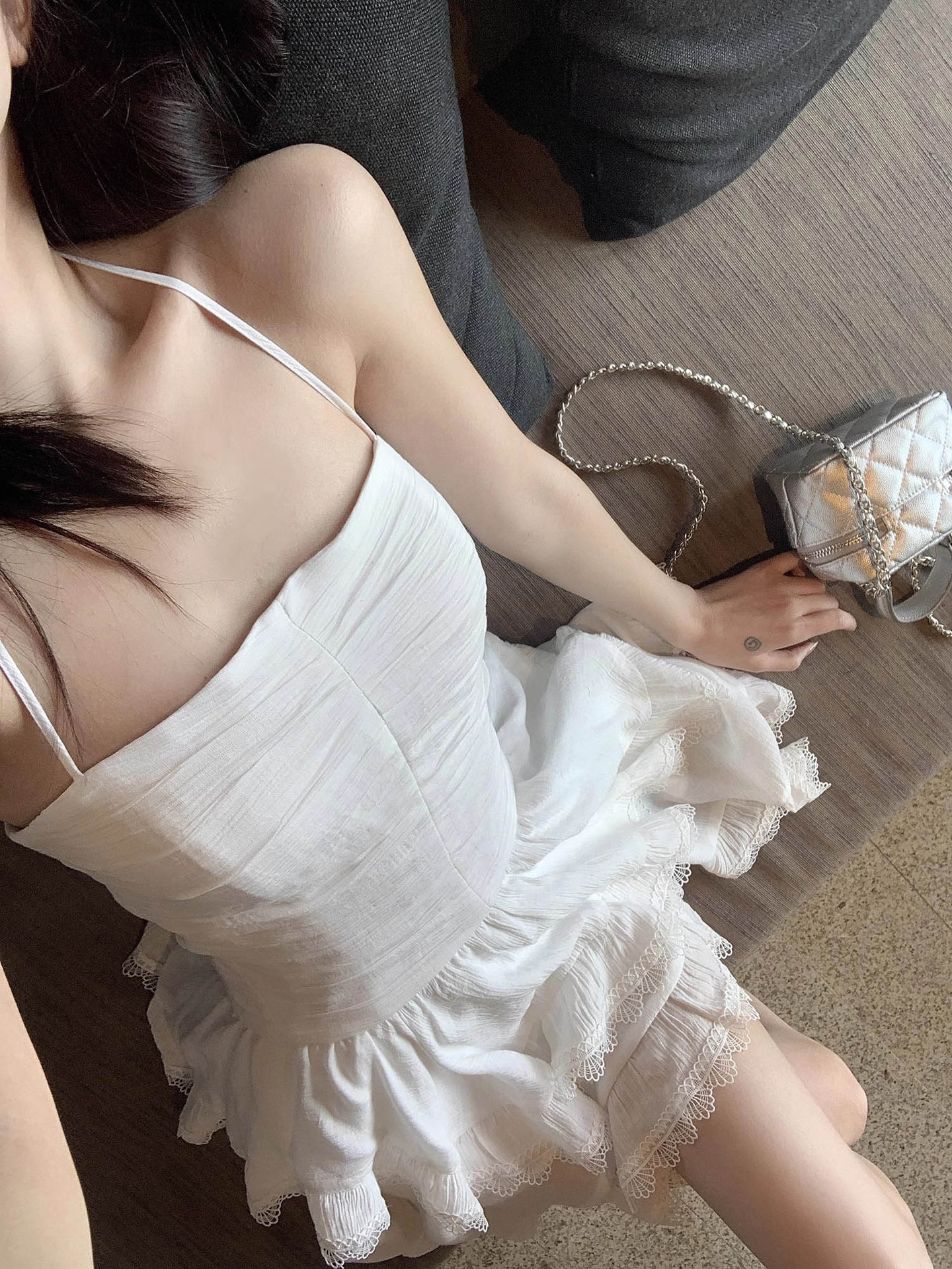 白色不规则下摆挂脖连衣裙女夏季新款韩版吊带背带挂脖礼服裙