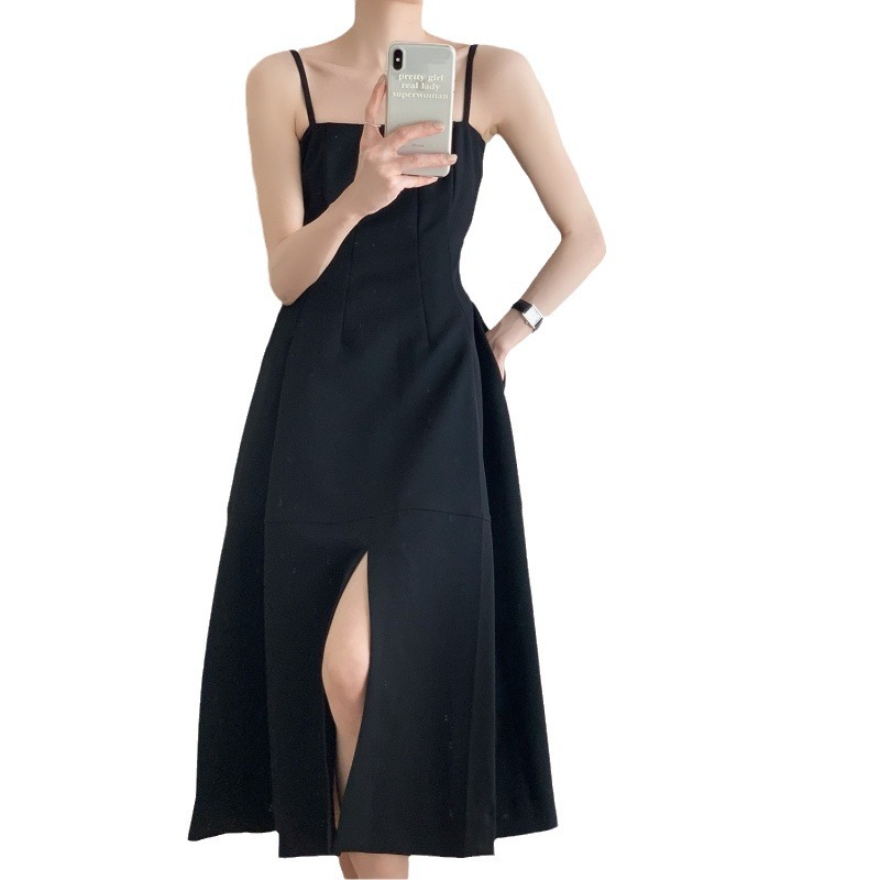 黑色复古赫本风开叉吊带小黑裙女高级感法式设计感小众高腰连衣裙